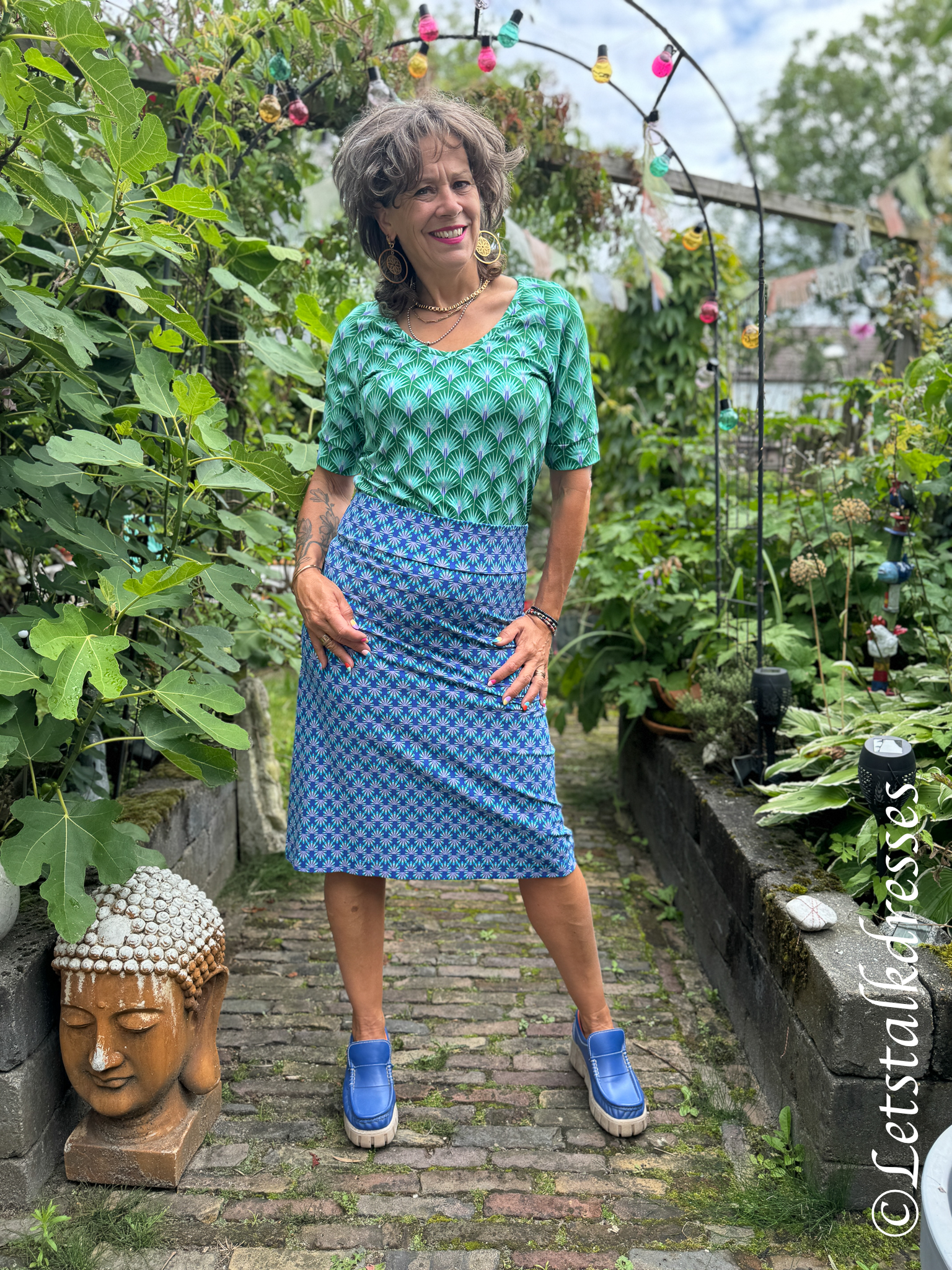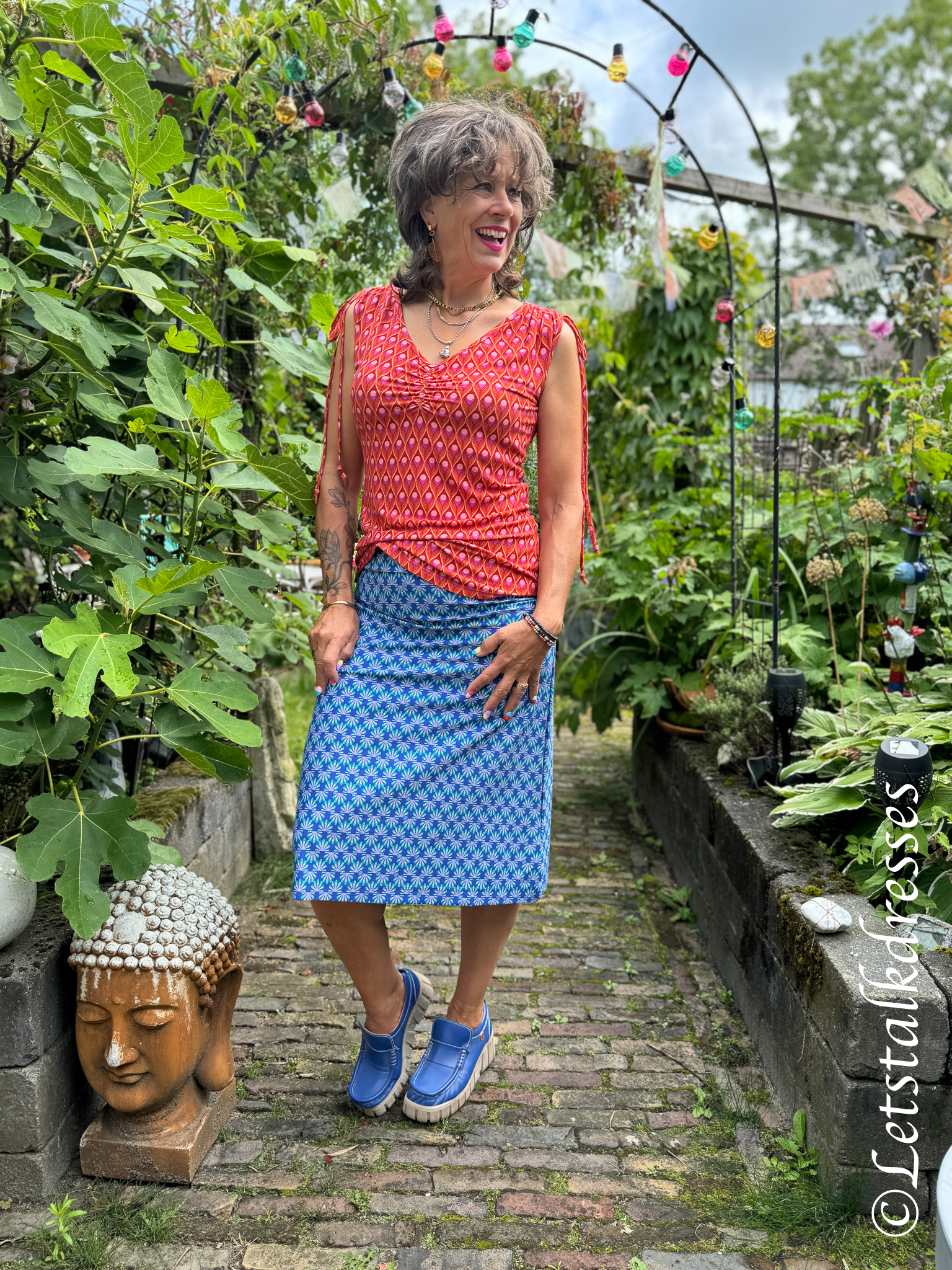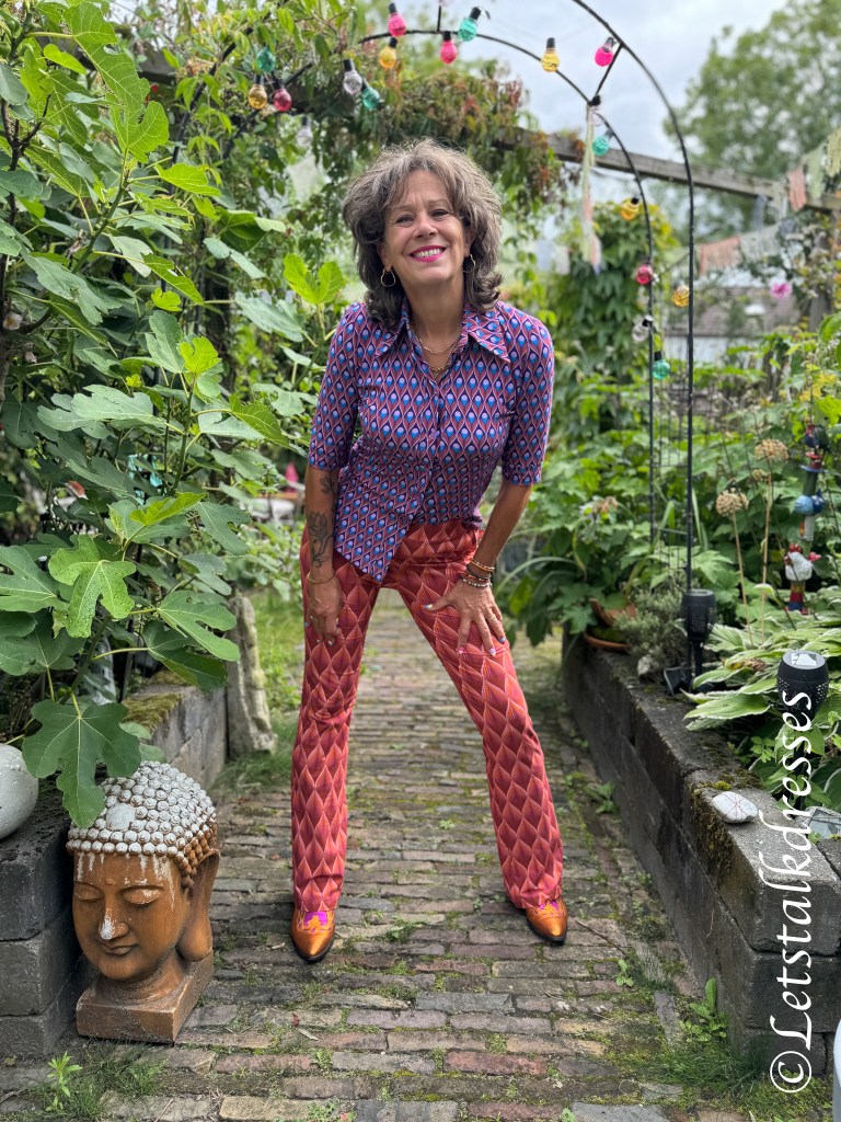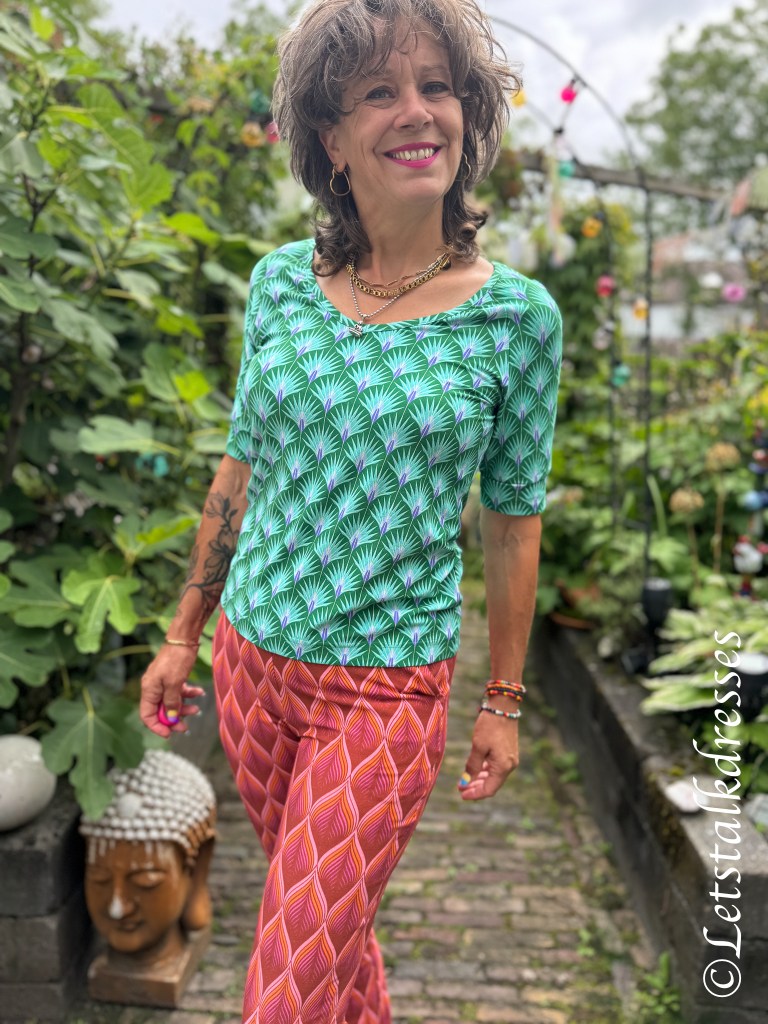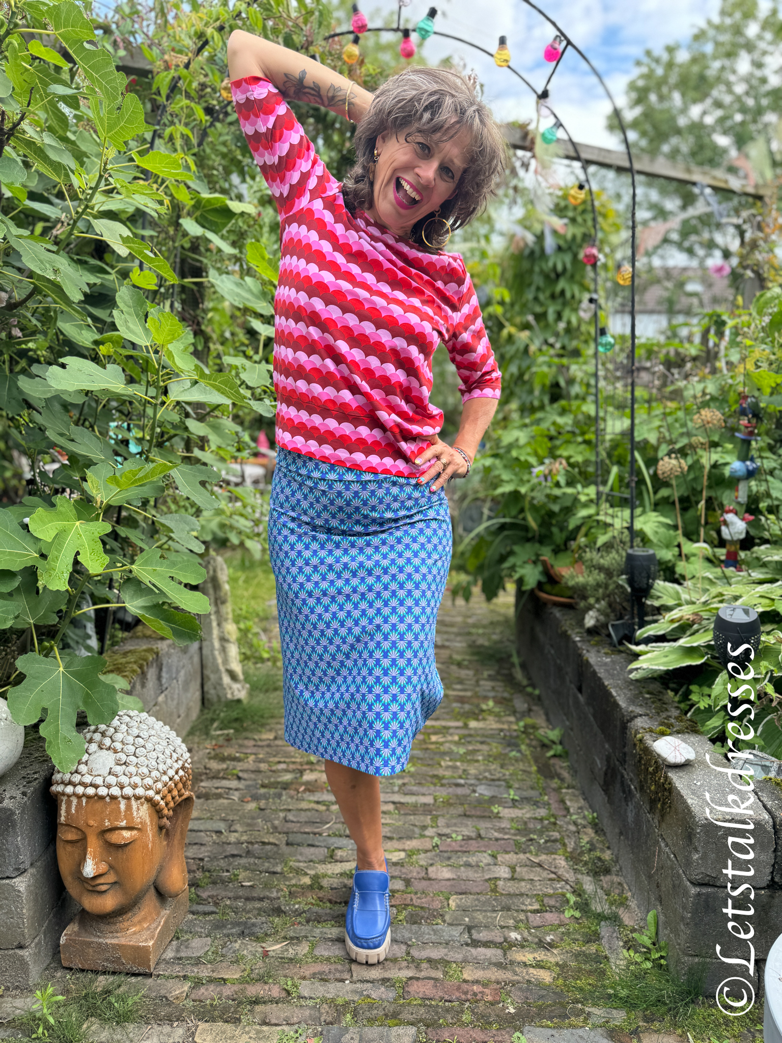Als allerlaatste item in de kleurrijke SS24 reeks van Tante Betsy, een heel nieuw model: Top Silly! Een echte blouson. Dat is een beetje een ouwelijke benaming maar het is wel precies dat: een damesshirt met een elastische boord. Die zorgt dat het shirt bloest en het buikje verbergt.