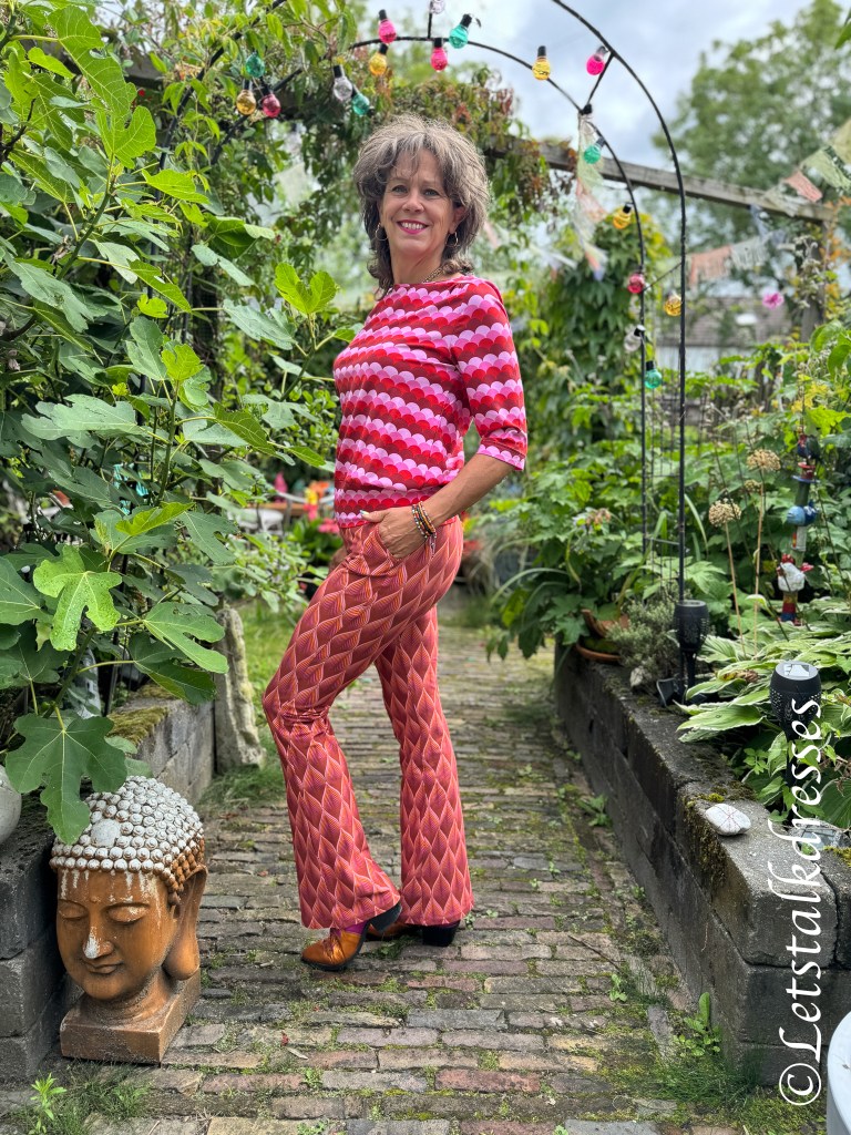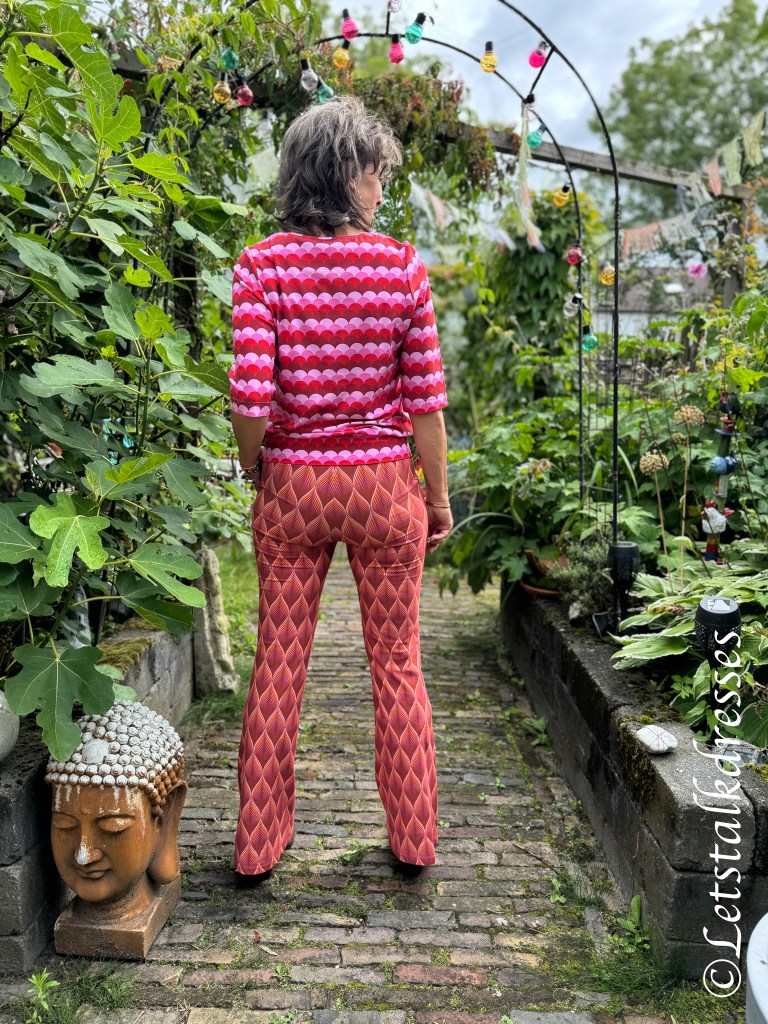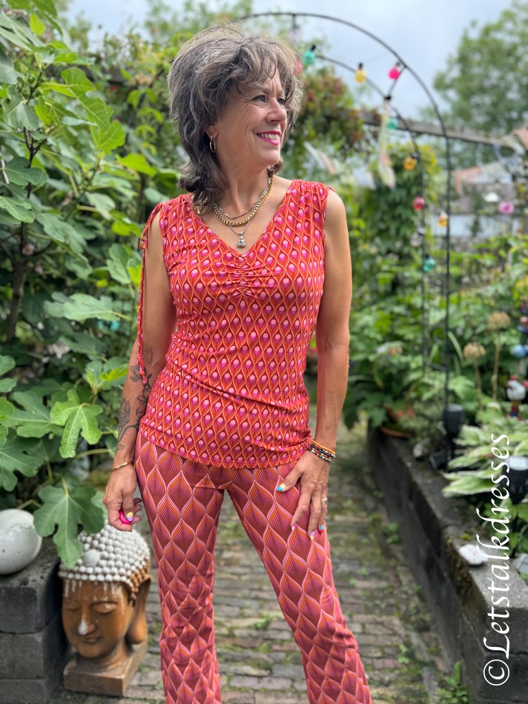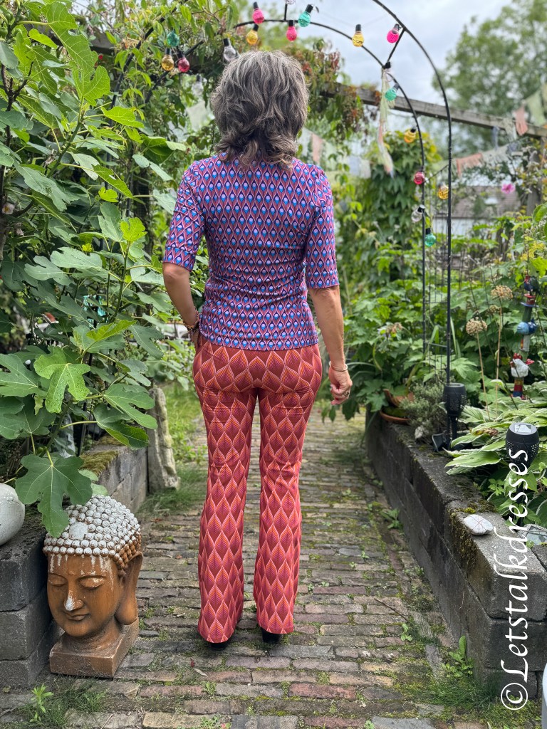 De Top valt denk ik op maat. Dames die echt tenger zijn vinden deze top wellicht te ruim. De print is mooi grafisch en echt jaren ’70. Hij doet een beetje denken aan die lavalamp van toen, vind ik.