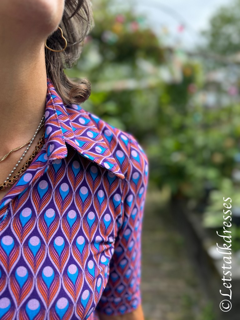 De knoopjes zijn van een lila achtig paarlemoer en vallen mooi weg tegen de print. De kraag is heel retro puntig. Draag hem gesloten voor een beetje camp en stoer als je hem los knoopt.