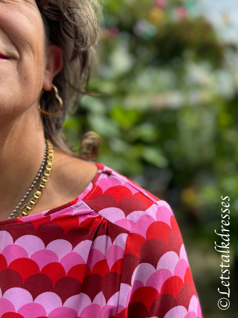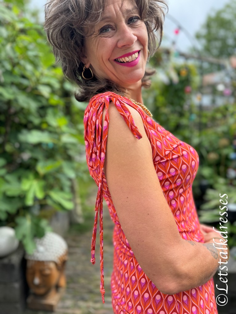 Het ruggedeelte valt laag maar een bh-bandje blijft keurig achter de stof zitten. In de zij waar de crossbody overgaat in de zijnaad, zijn die ooh zo handige en camouflerende plooitjes gemaakt zodat ons buikje mild verhuld kan worden.