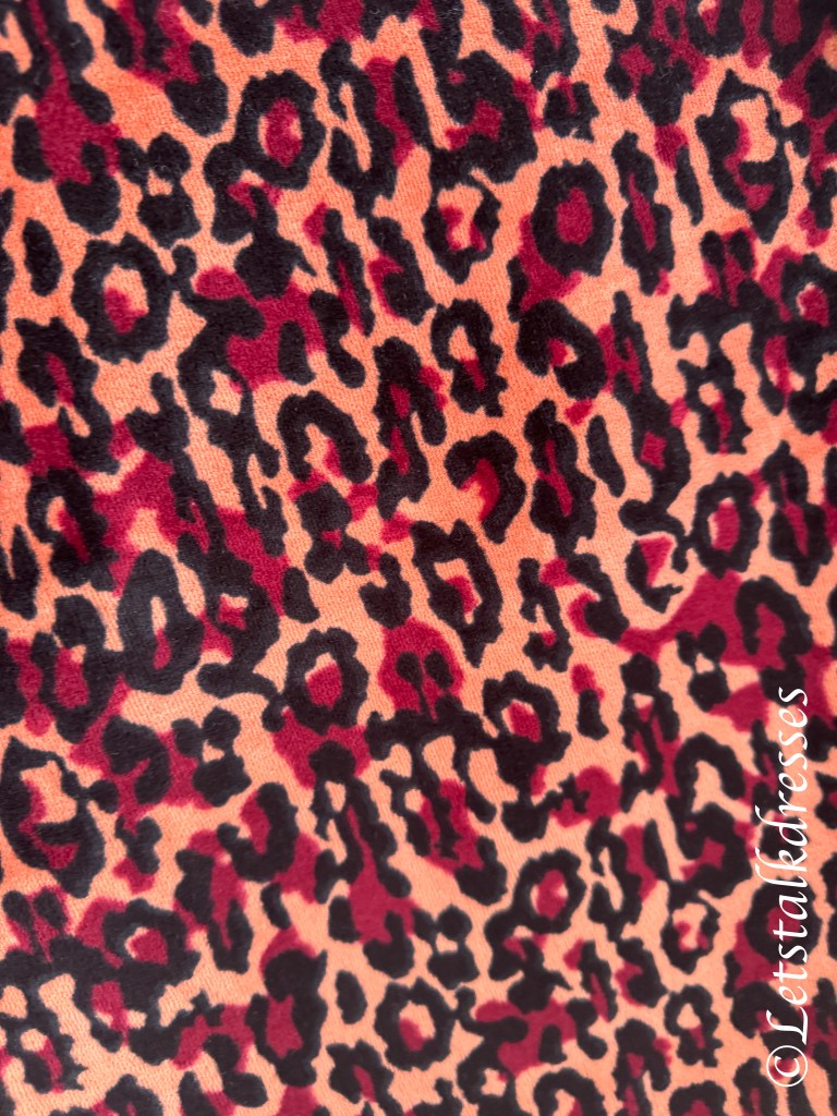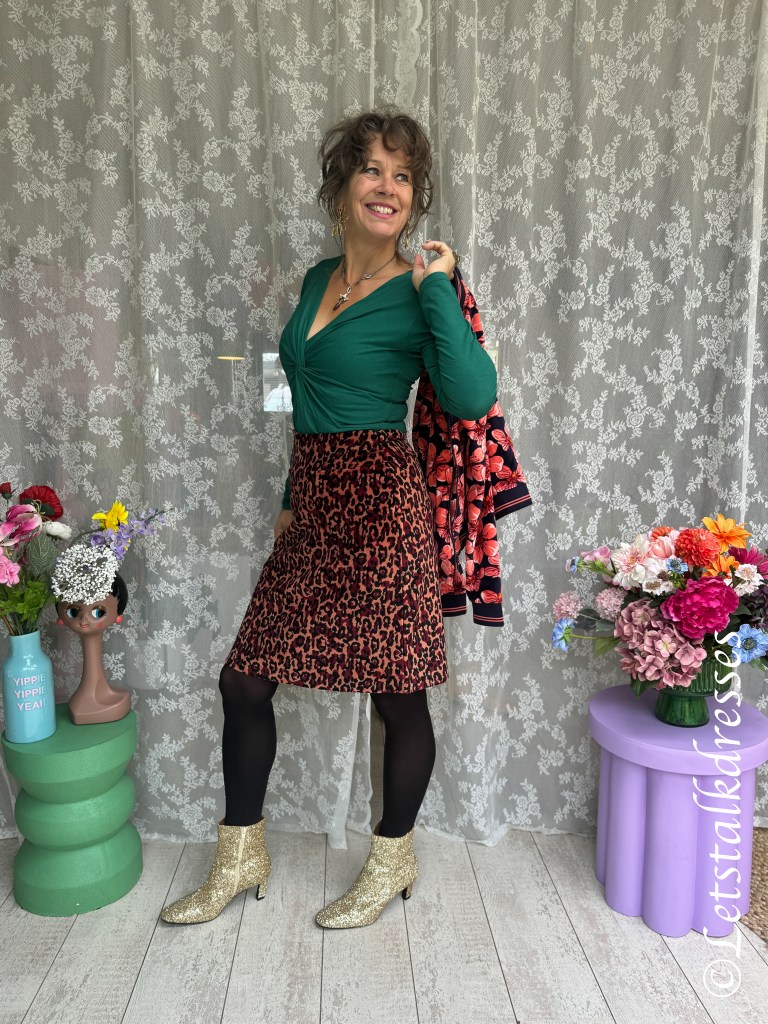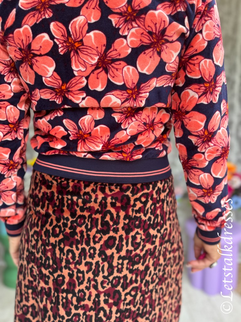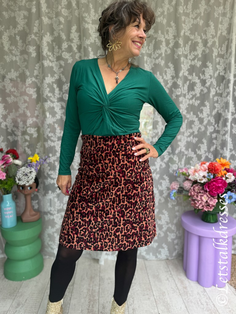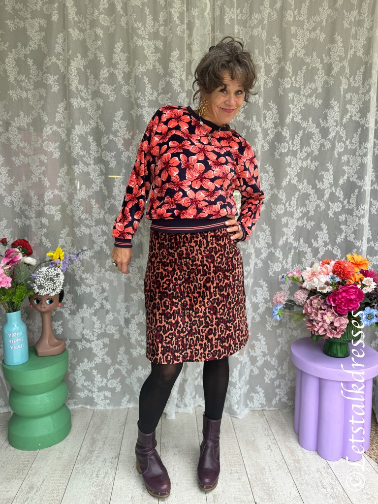 Velours is een heerlijk stofje voor de winter. Lekker zacht en lekker warm. Combineer hem met een fijne dikke panty of maillot en je hebt een prima warme winterlook te pakken. De print is een best wel drukke panterprint. De warme tinten maken hem goed combineerbaar met allerlei herfsttinten die op dit moment zo populair zijn.