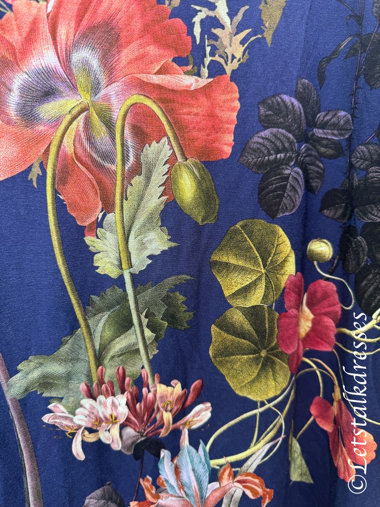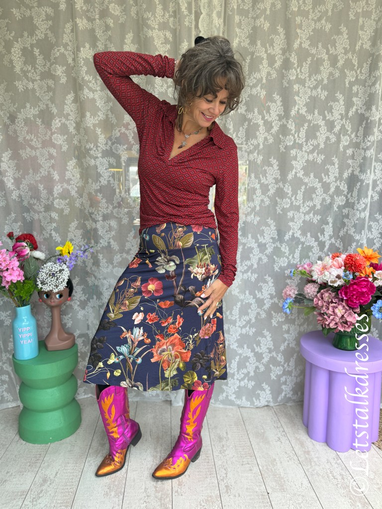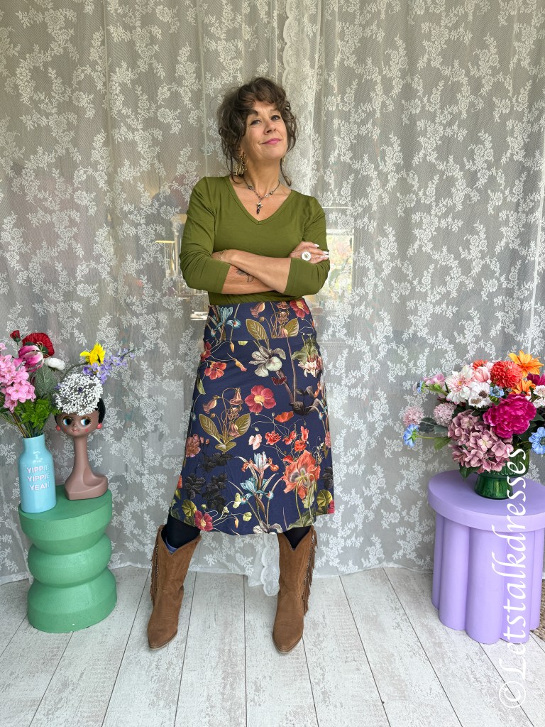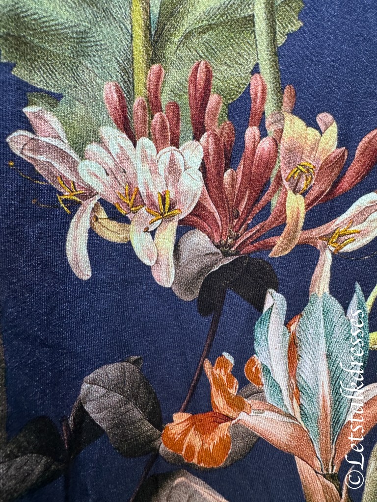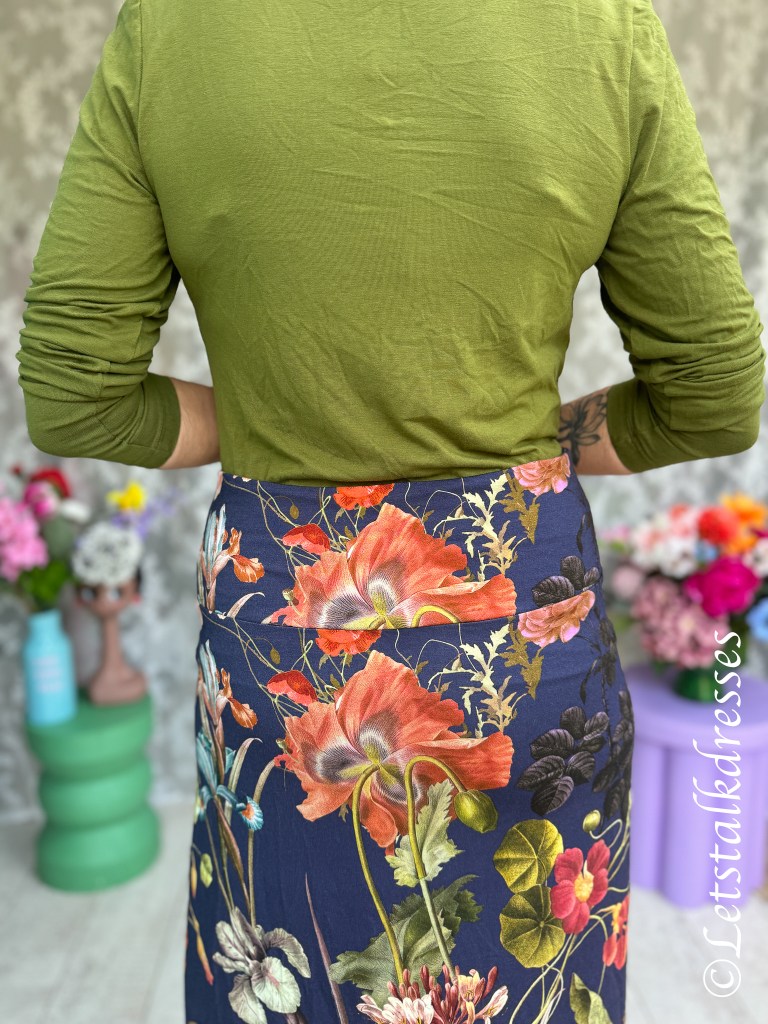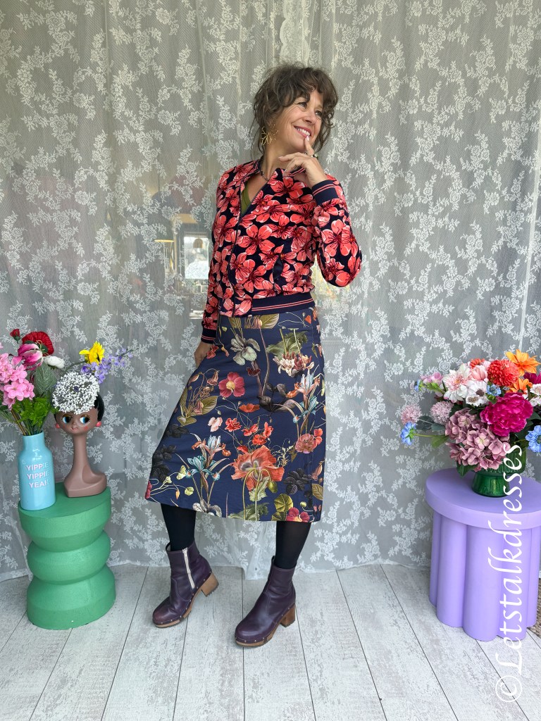 De print is toch echt weer zo’n kroonjuweel van LaLamour! Wat een schitterende print met dito kleuren toch weer. Deze print kan toch meteen in zo’n wetenschappelijk biologie boek?! Zoveel details in en op de bloemen, de fijne kleurschakeringen, de insectjes en ook zoveel diepte in de print. Je komt wel binnen hoor als je met deze rok een ruimte in loopt.