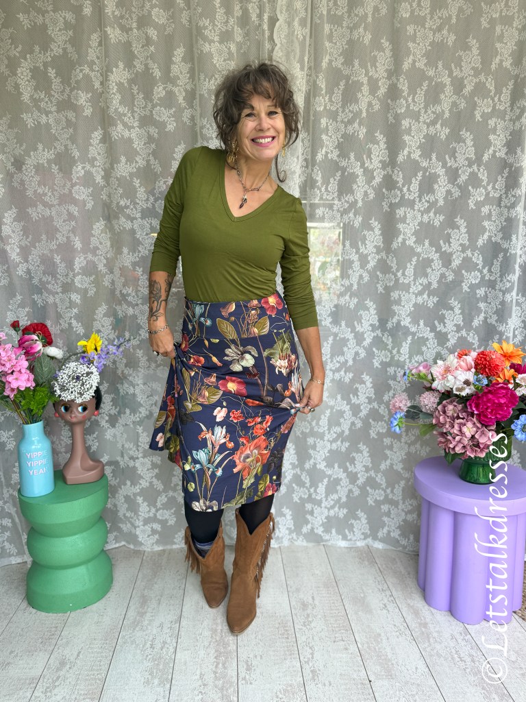 Skirt Claudia heeft ook een taillemaat van 40cm en heeft een lengte van 72,5cm. Door het tricot Ecovero valt hij schitterend licht golvend naar beneden zodat hij altijd goed zit. Deze rok valt mij met mijn 173cm prima op de kuit. Skirt Claudia is in deze collectie ook uitgebracht in de print ‘Autumn Leaves’, ‘Sweat Ginkgo’, Hazel Dot Green & Blue en in ‘Sweet Royal’.