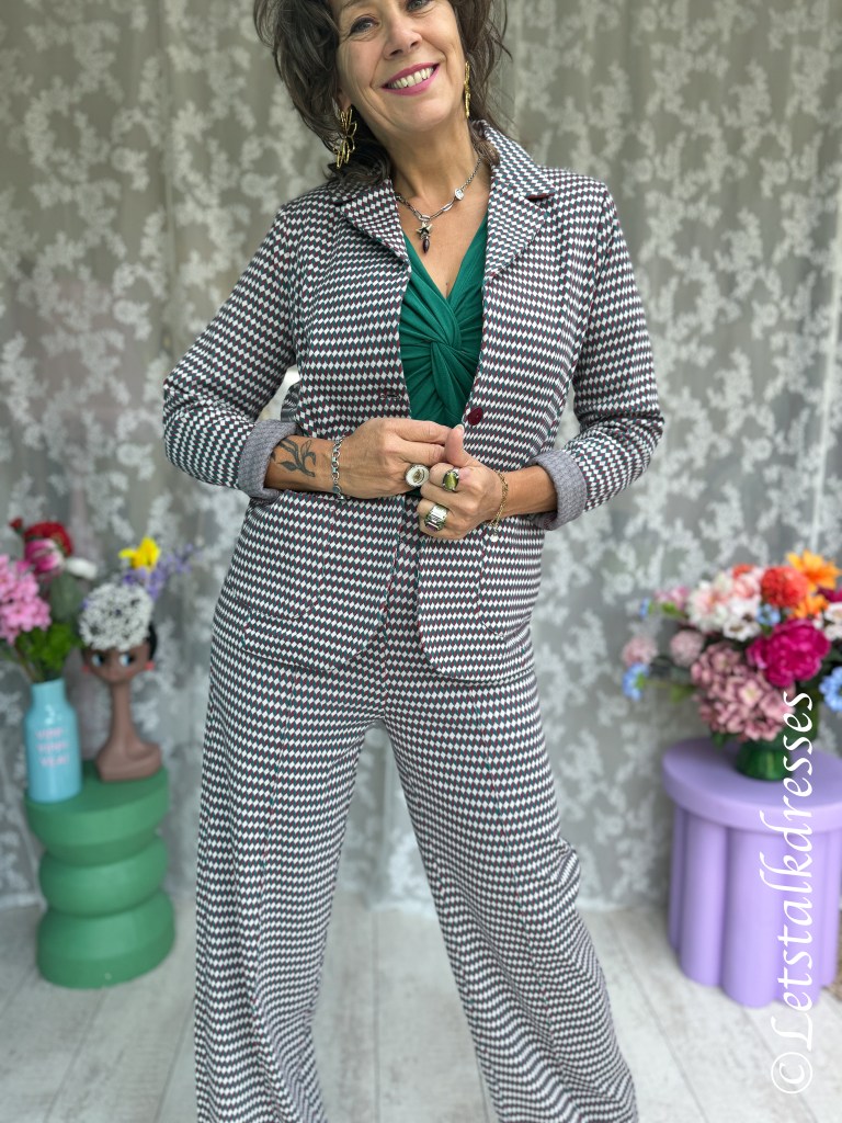 Jacquard is een gebreide stof. Het gebruikte garen is een mix van organic cotton en elastane. De stof is lekker warm, goed stevig en het valt een beetje zwaar. Echt een kwaliteitsstof dus. De blazers hebben een kleine schoudervulling en de revers blijven heel mooi in model vallen.