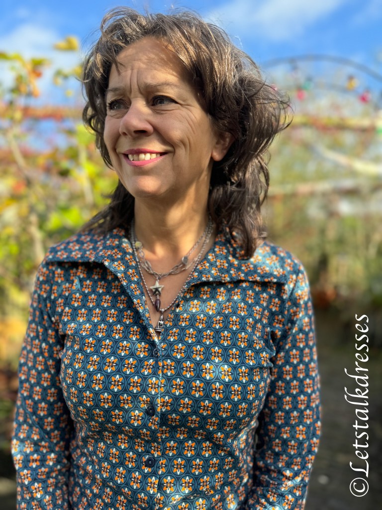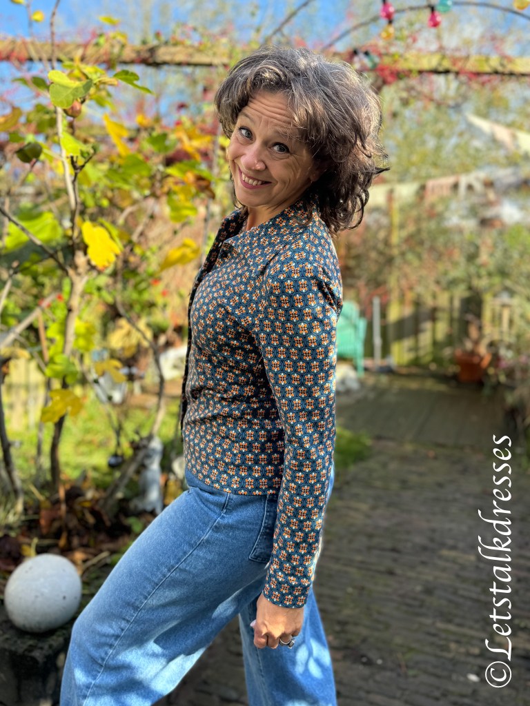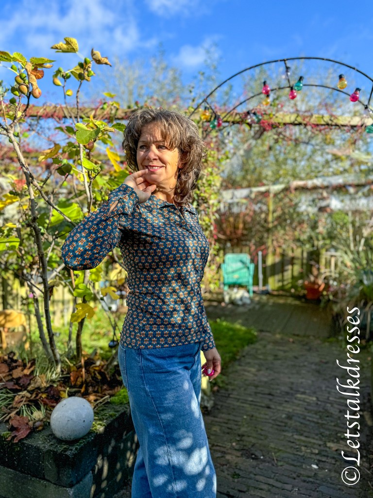 Blouse Sara is uiteraard ook uitgebracht in de print Porto Red en daarnaast ook nog in de print Autumn Garden. Dan is het gebruikte tricot wel weer Ecovero. Iets dunner dan de organic cotton van de Porto printjes en ook iets meer soepel vallend.