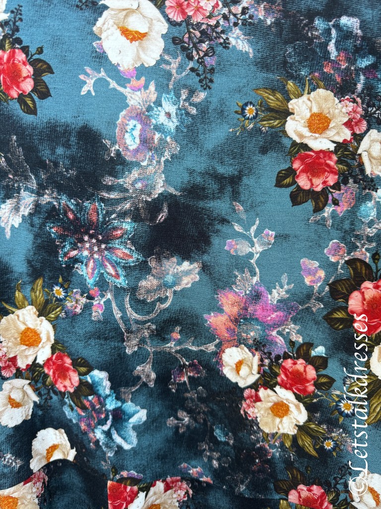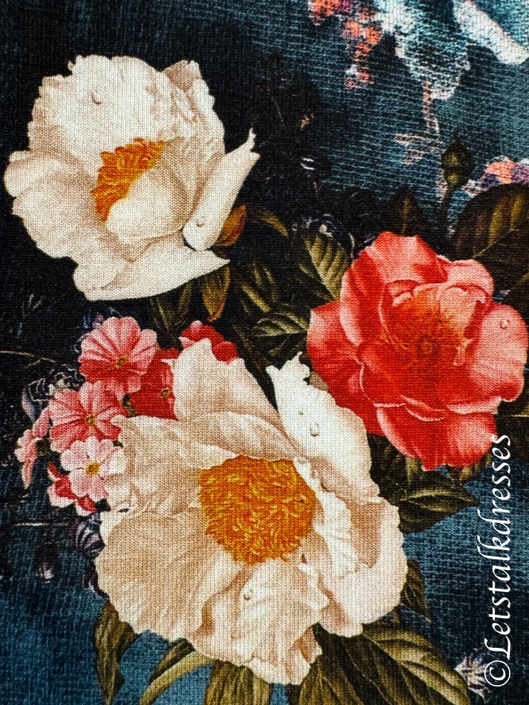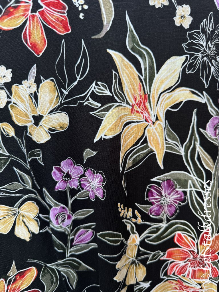 De geweldig mooie en levendige print springt er weer uit. De ondergrond is zwart. Door de bladeren van de bloemen met witte lijnen te tekenen krijg je een soort stoer en transparant effect. Heel bijzonder dat de dan de kleuren weer die mooie licht-donker verloop hebben.