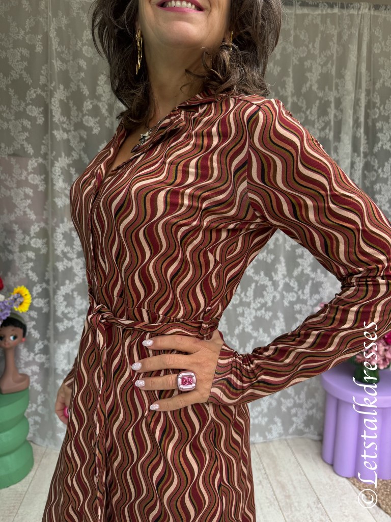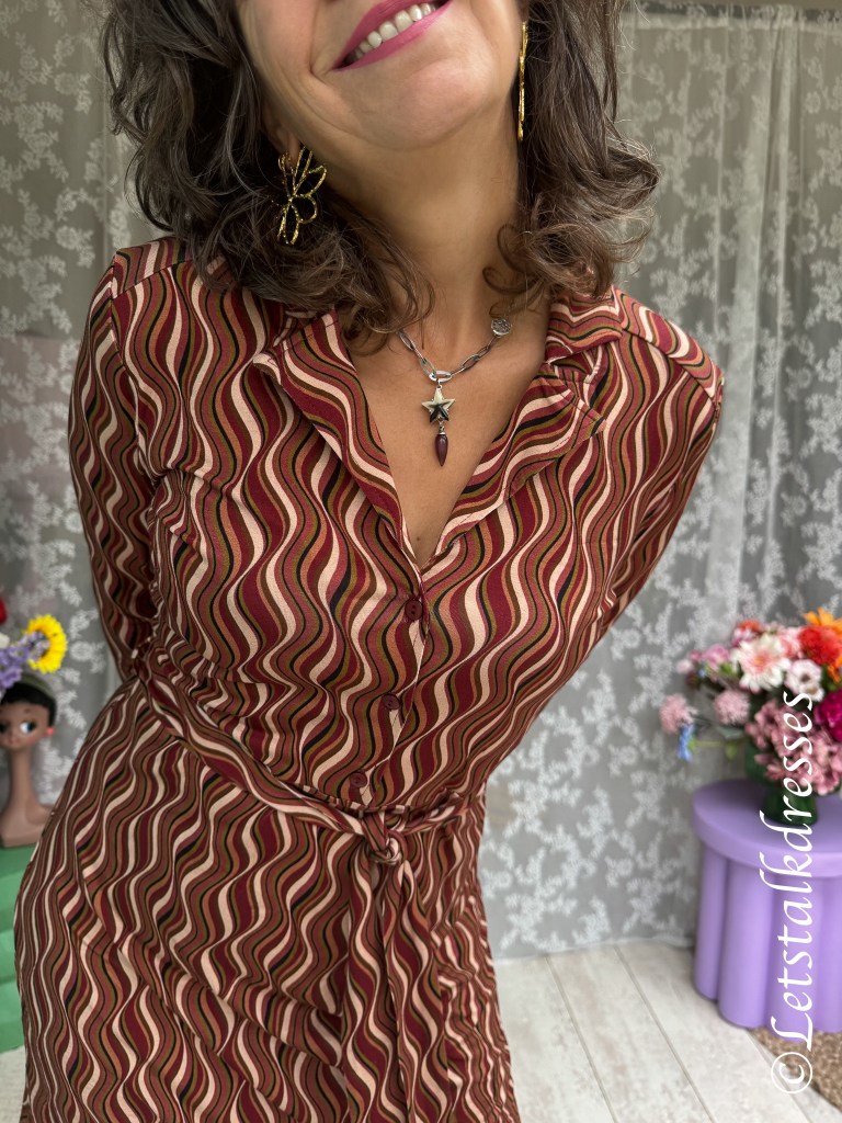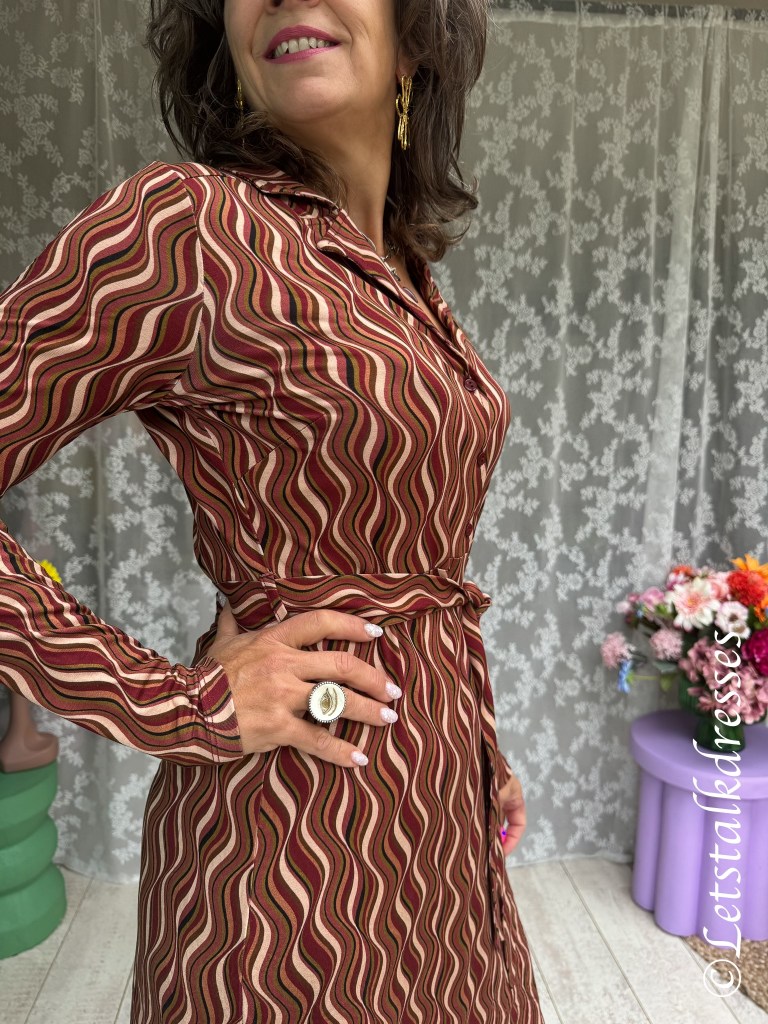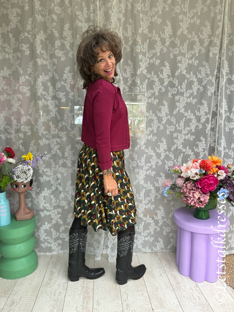 De print is die mooie Glaze… Hij doet mij echt denken aan die glazen knikkers van vroeger, waar zo’n 3-kleurig slingertje in zat. Ze waren niets waard maar eigenlijk veel mooier dan vele andere knikkers. De print komt in 2 varianten. In mijn blog over de topjes zag je al de petrol variant. Dress Monique laat ik nu in de rode versie zien. Hoofdtonen zijn echt wel bordeauxrood en poederroze.