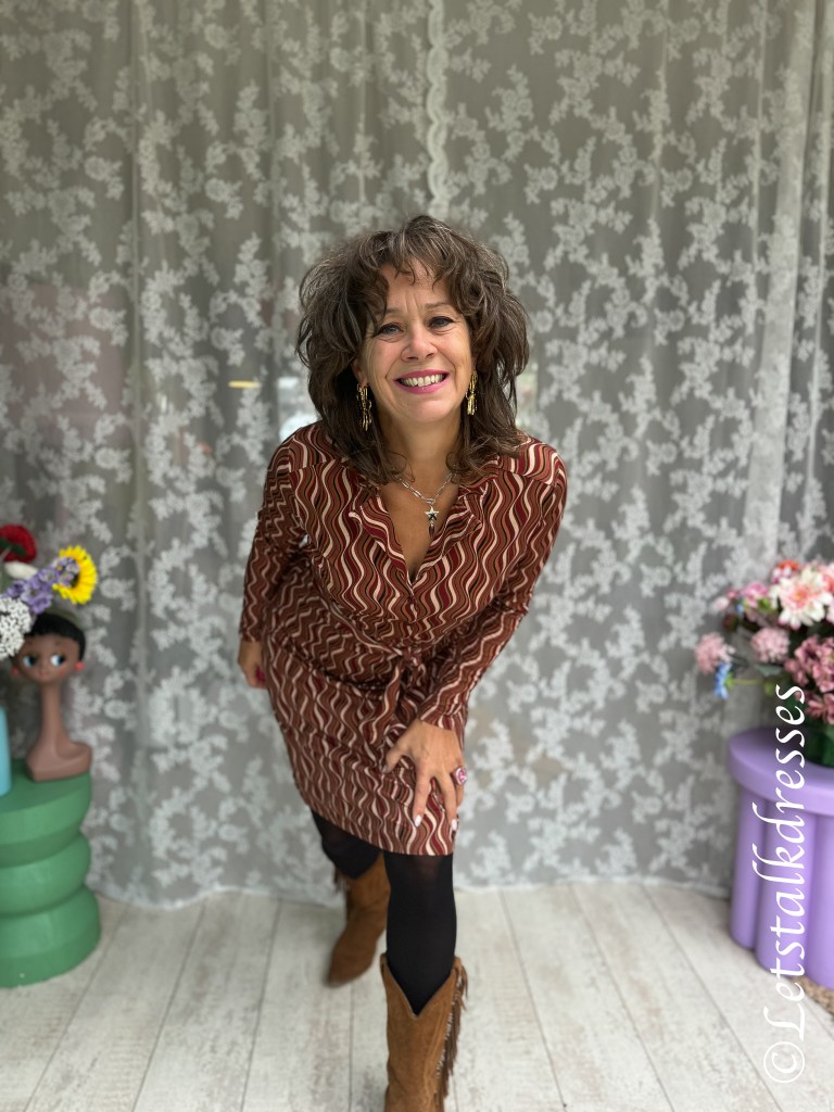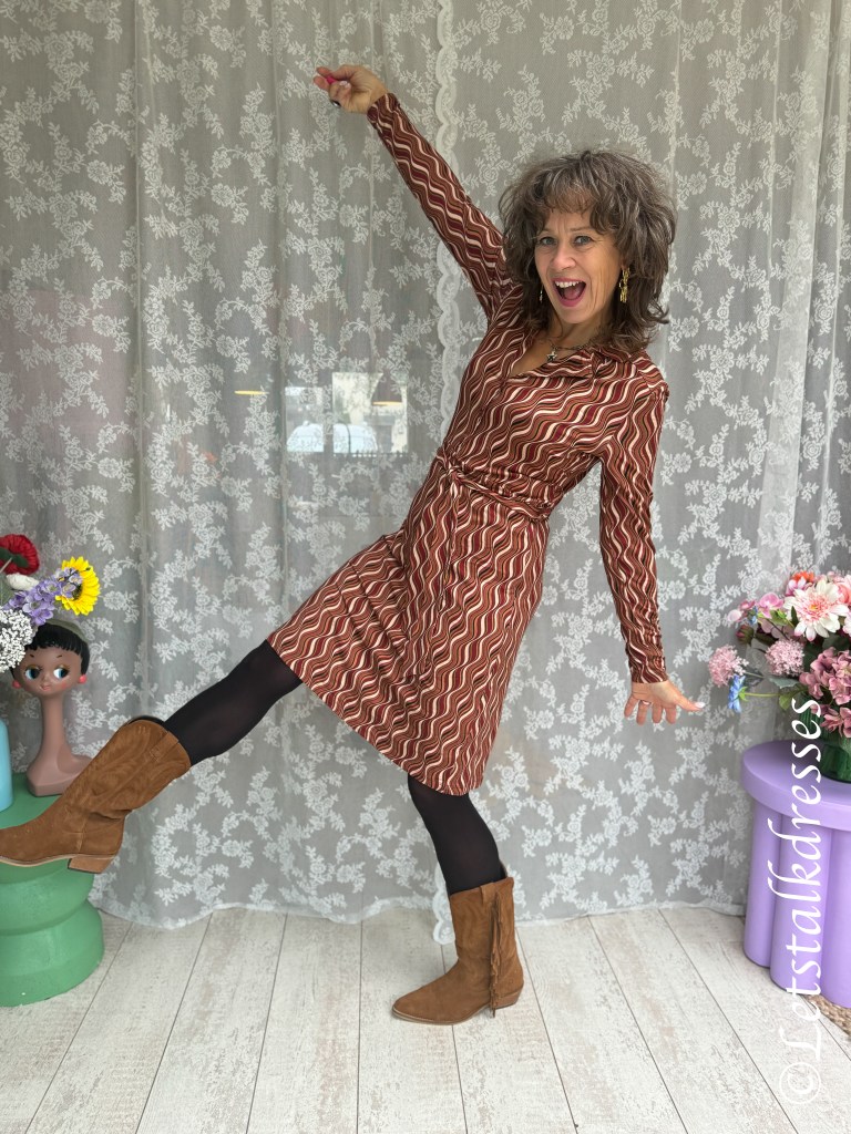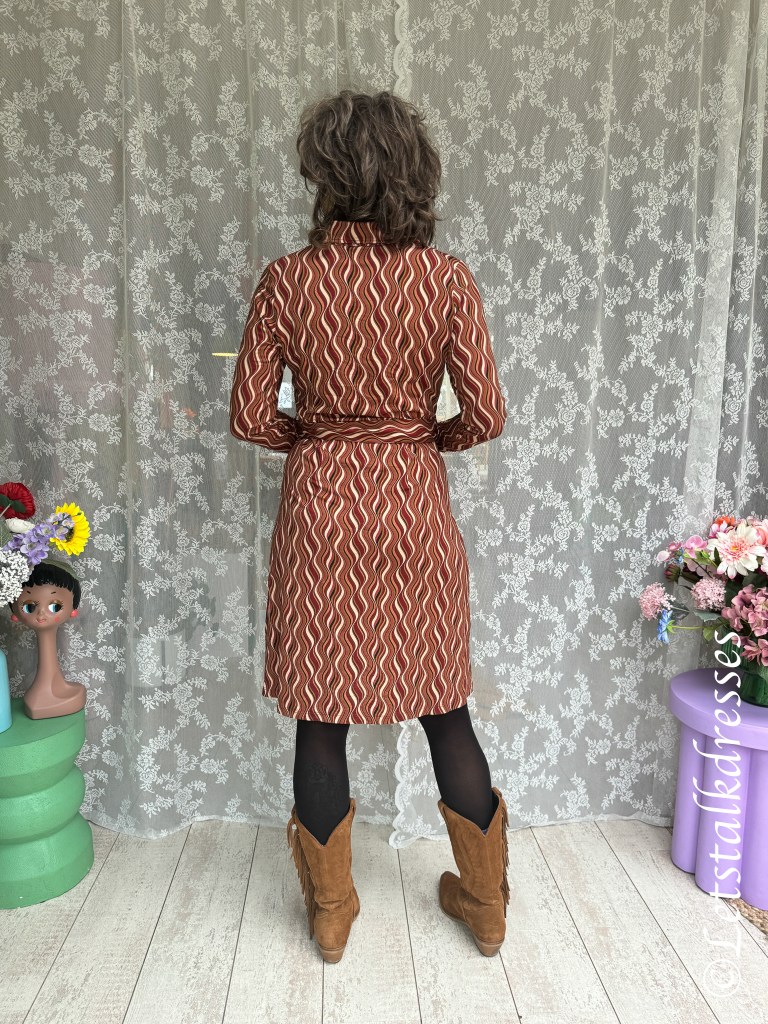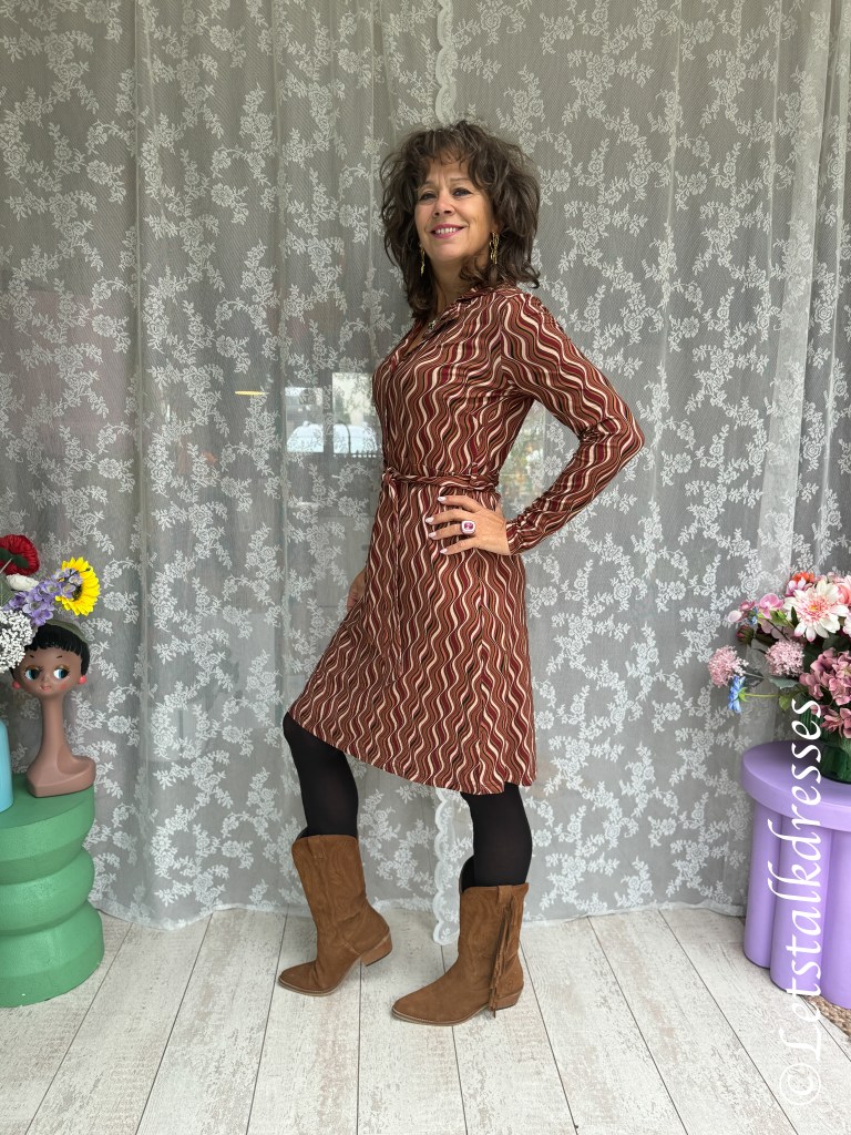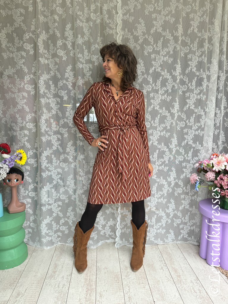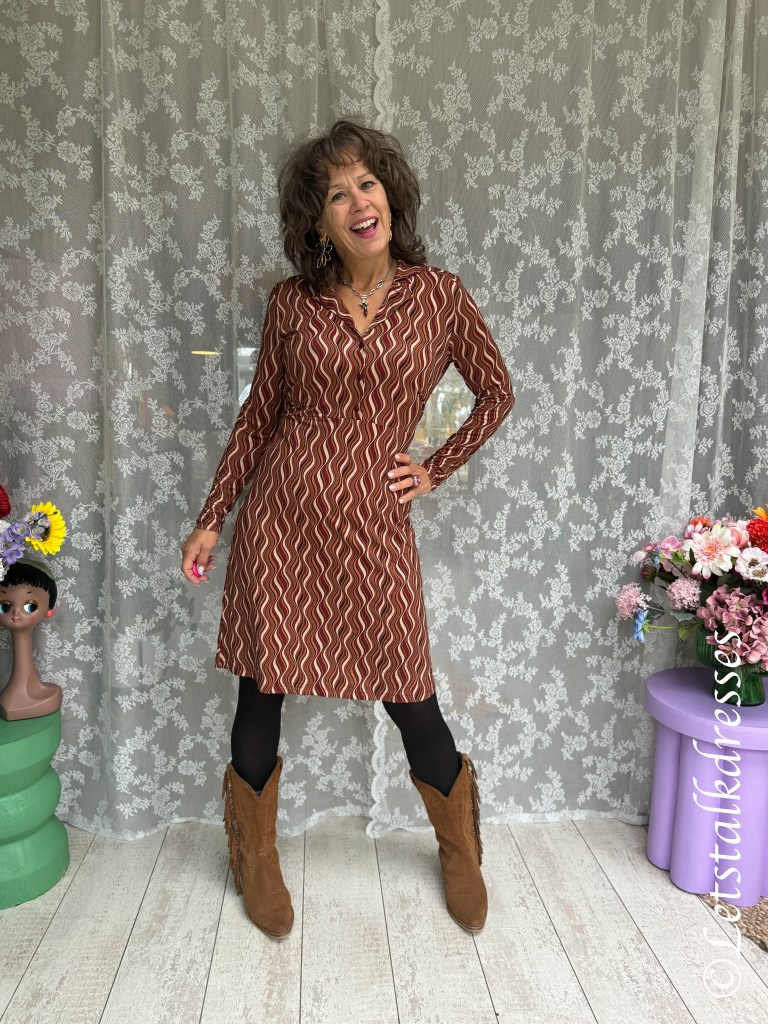 Het model is een mooie vrouwelijke A-lijn die vanaf de heupen licht uitwaaiert. De rok is wat langer waardoor hij mij mooi op de knie valt met mijn 1.73cm. De revers kraag geeft de jurk een wat meer sophisticated uitstraling. Je kan hem prima dragen onder een jackje (spijker voor stoer, colbertje voor zakelijk, bolerootje voor feestelijk). Draag hem met boots voor de stoer en casual. Kies pumps voor feestelijk.