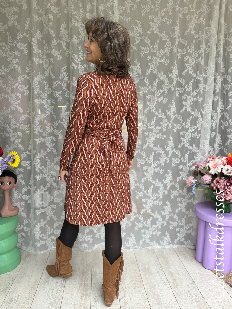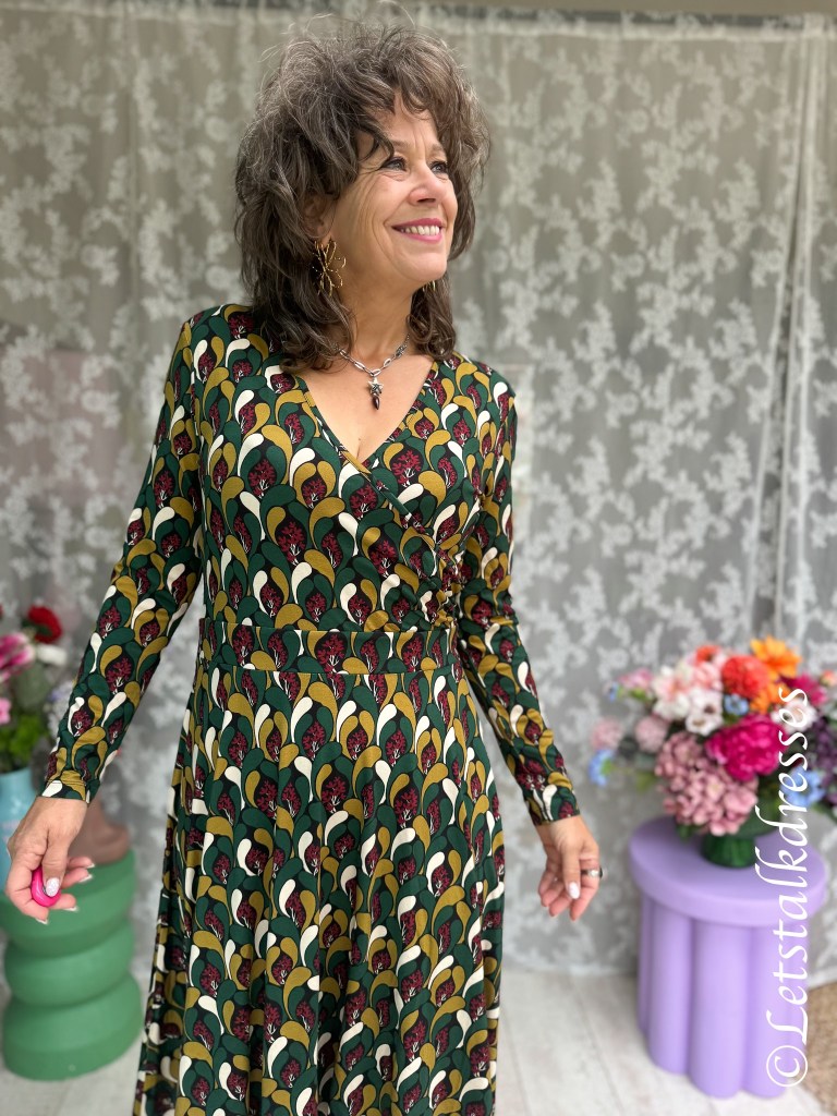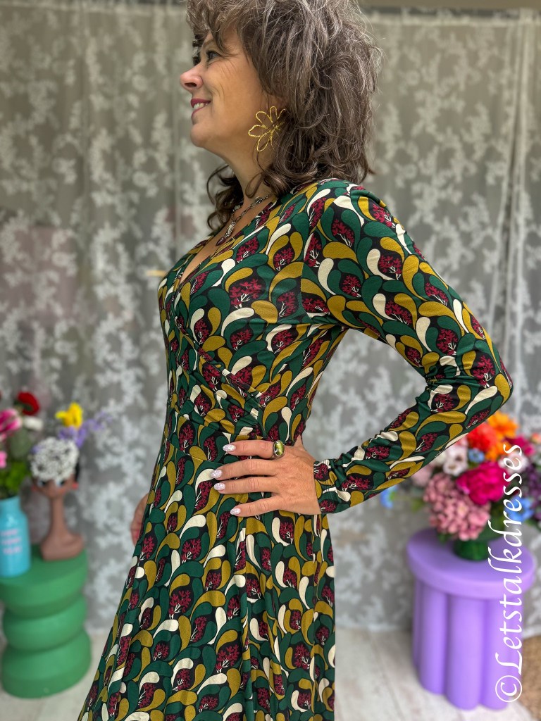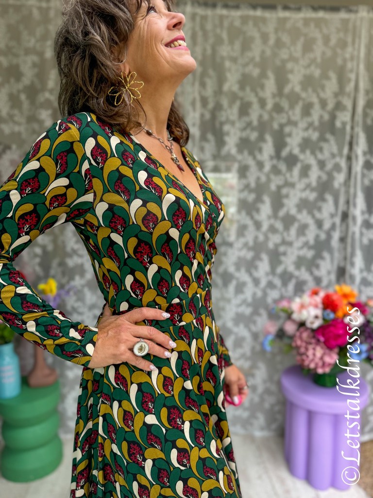 Het lijfje van Dress Daisey is een klassieke overslag. Deze overslag is niet dichtgestikt en loopt over het hele lijfje door naar de andere kant. Daar zit ie met enkele sierplooitjes vast aan de zijnaad. Hierdoor maskeert de dress enkele ongewilde rolletjes die wij toch vaak wel hebben hè dames?!