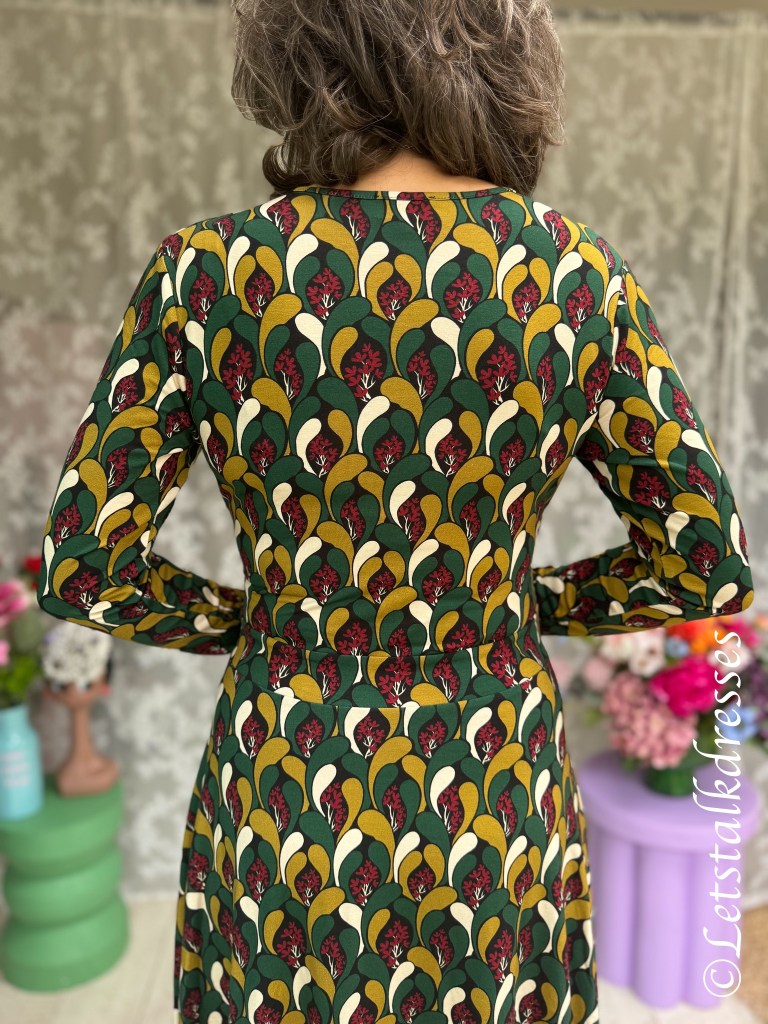Dit is uiteraard vooral te danken om de print Nina! Wat een heerlijk printje is dat zeg. Heel mooie kleurtinten die spot-on zijn voor dit herfst/winter seizoen. Mosterdgeel, Forrest-groen en bordeauxrood. Hier en daar een spatje wit en zwarte lijnen die de blaadjes kaderen (ten minste…, ik denk dat het bladeren zijn).