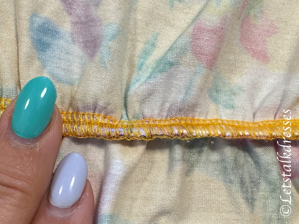 De taille van de jurk bestaat uit een aangerimpeld elastieken randje die aan de binnenkant het topje verenigt met het rokgedeelte. Je kan hier ook mooi een riem overheen kunnen doen maar het hoeft niet. De taille is enorm elastisch dus rekt supergoed mee.
