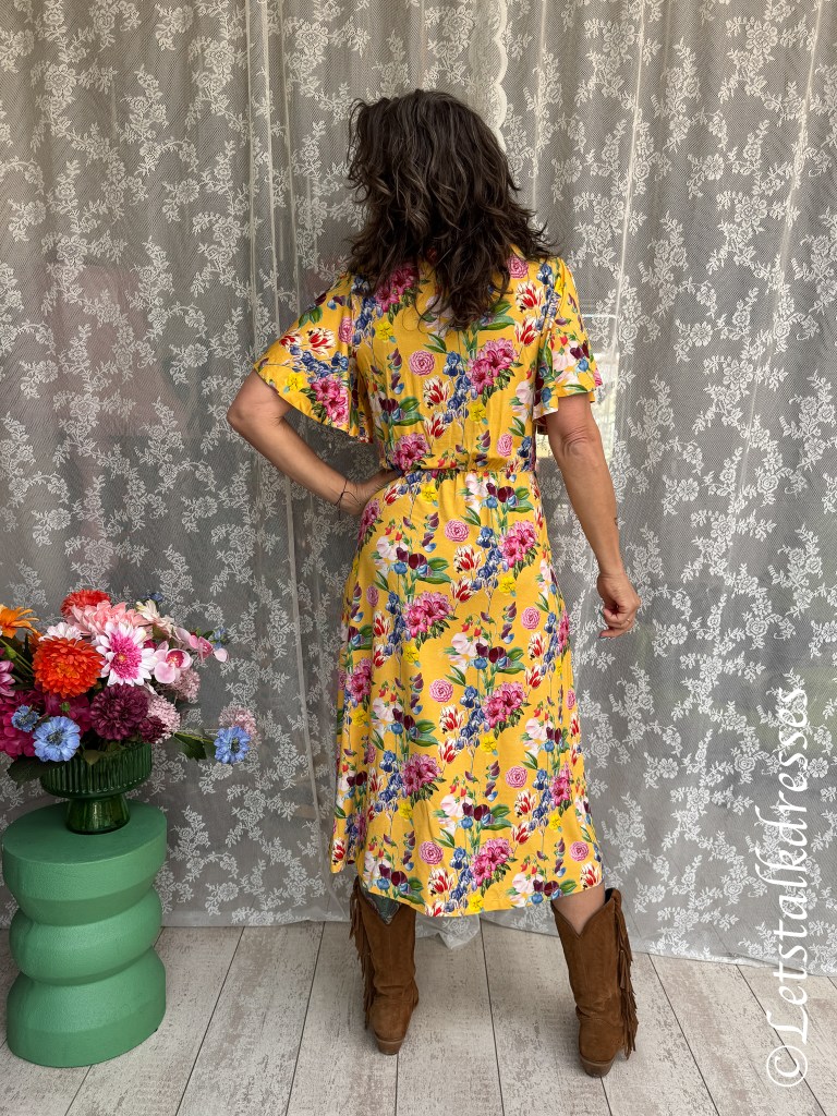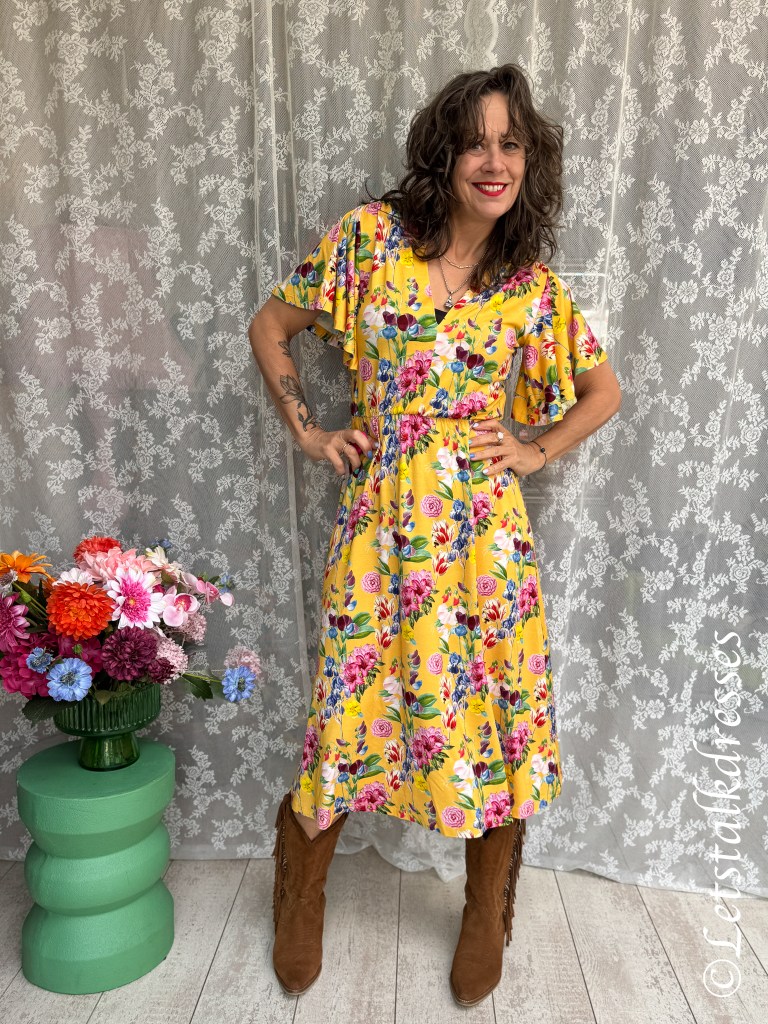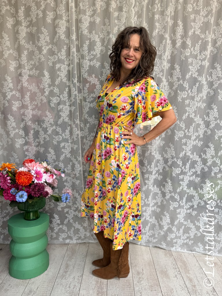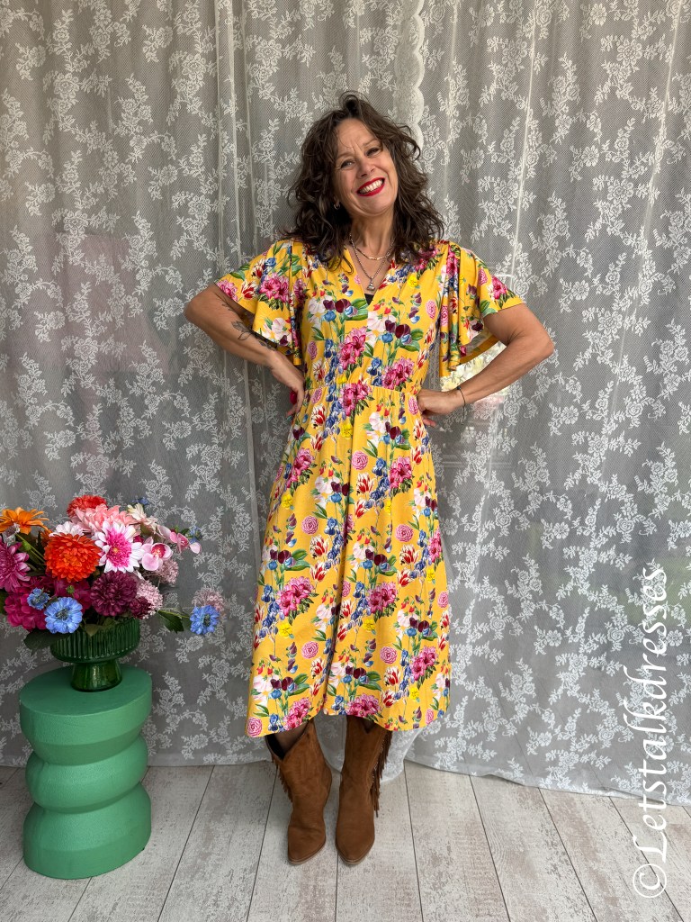Een zomers goudgeel veld vol met prachtige bloemen in geweldig heldere kleuren! In een print zo loepzuiver en scherp! En om dan het effect extra te vergroten, komt LaLamour met een nieuw zomers model: Dress Trix Butterfly Sleeve!