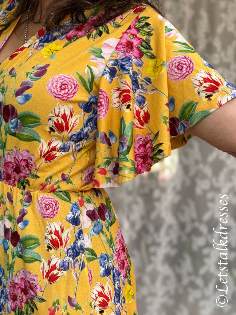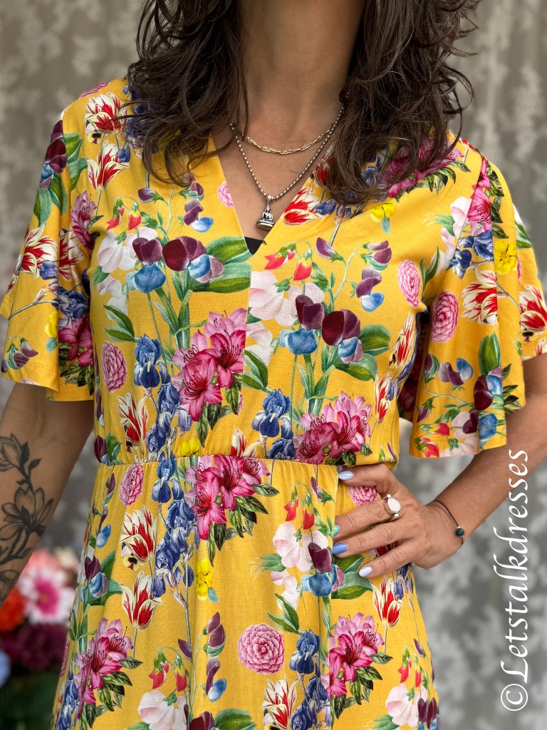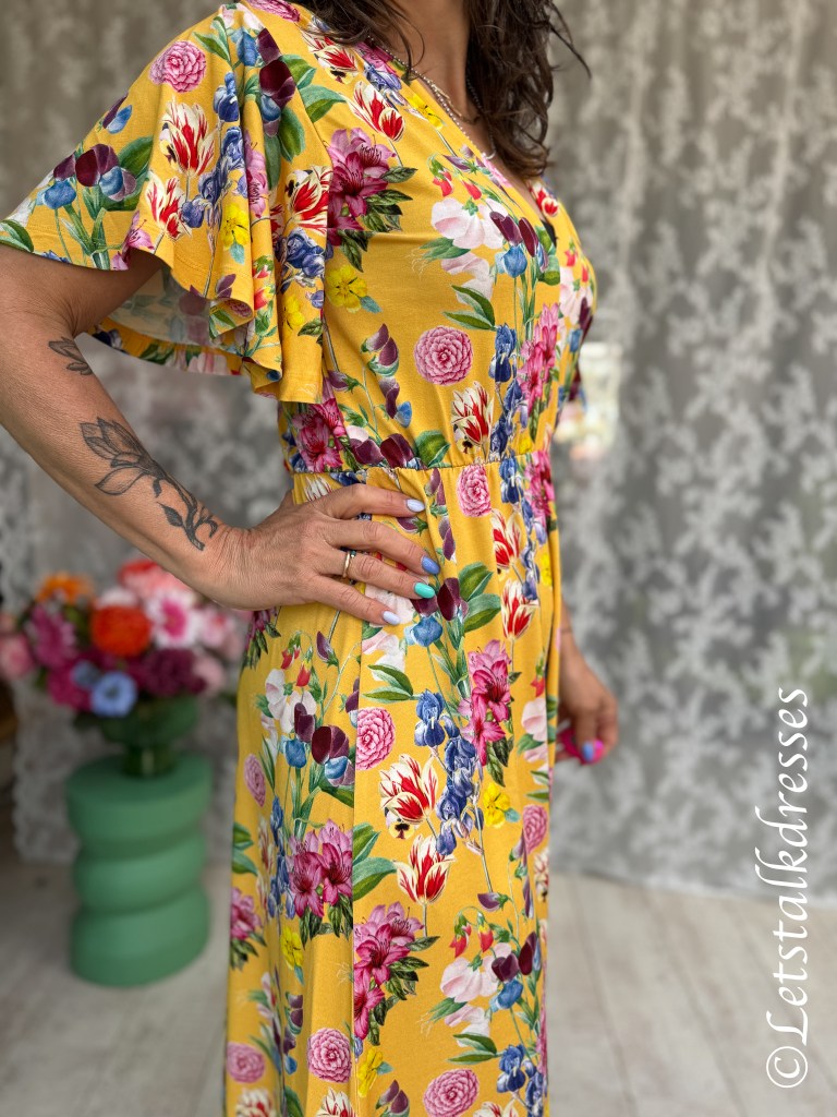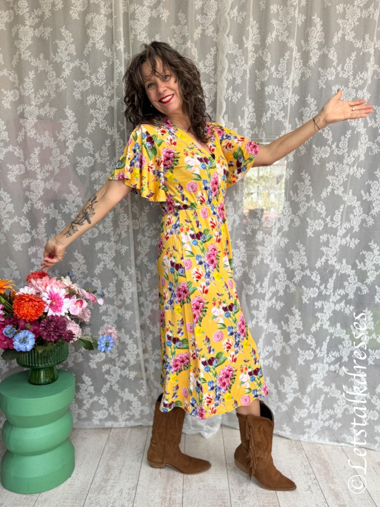 Een zomers goudgeel veld vol met prachtige bloemen in geweldig heldere kleuren! In een print zo loepzuiver en scherp! En om dan het effect extra te vergroten, komt LaLamour met een nieuw zomers model: Dress Trix Butterfly Sleeve!