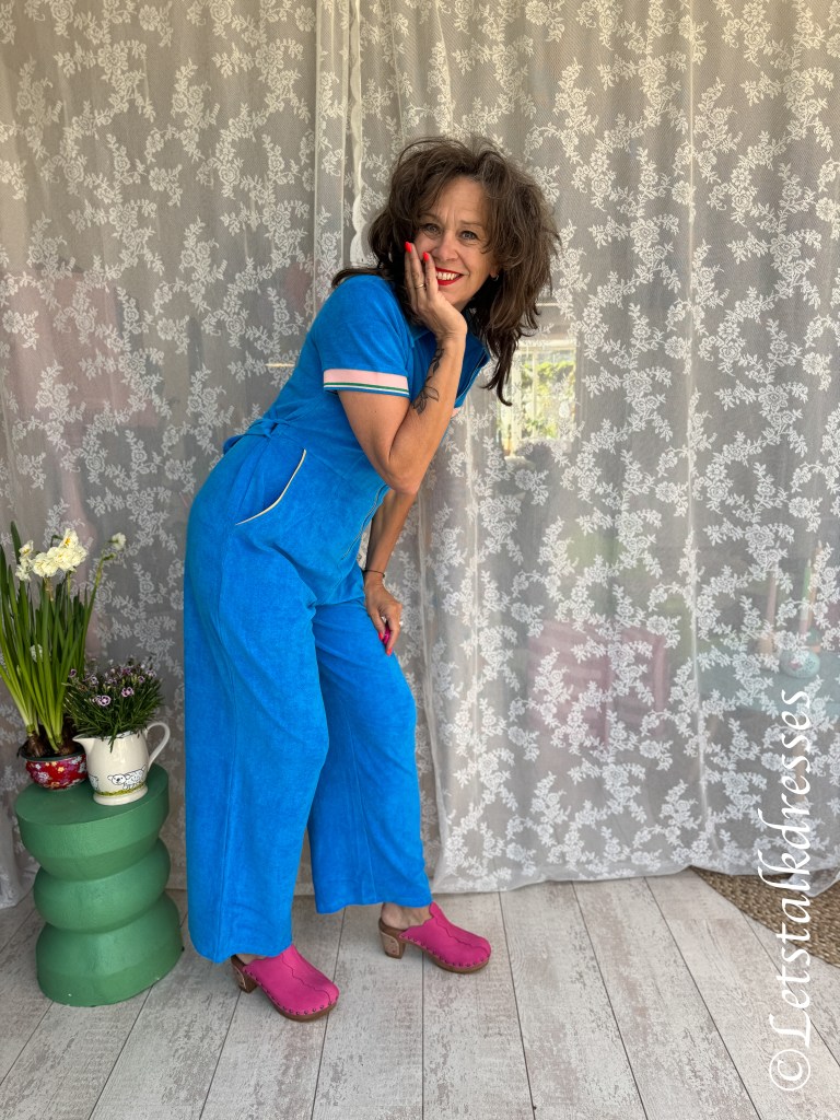 Voor het gemak zal ik hem toch ook maar een jumpsuit blijven noemen😉. Deze toffe Bella is gemaakt van het heerlijk luchtige, licht van gewicht en goed vocht-opnemende badstof van biologisch katoen. Dit lijkt een dikke en dus warme stof maar echt geloof me: hij is juist perfect voor de zomer!