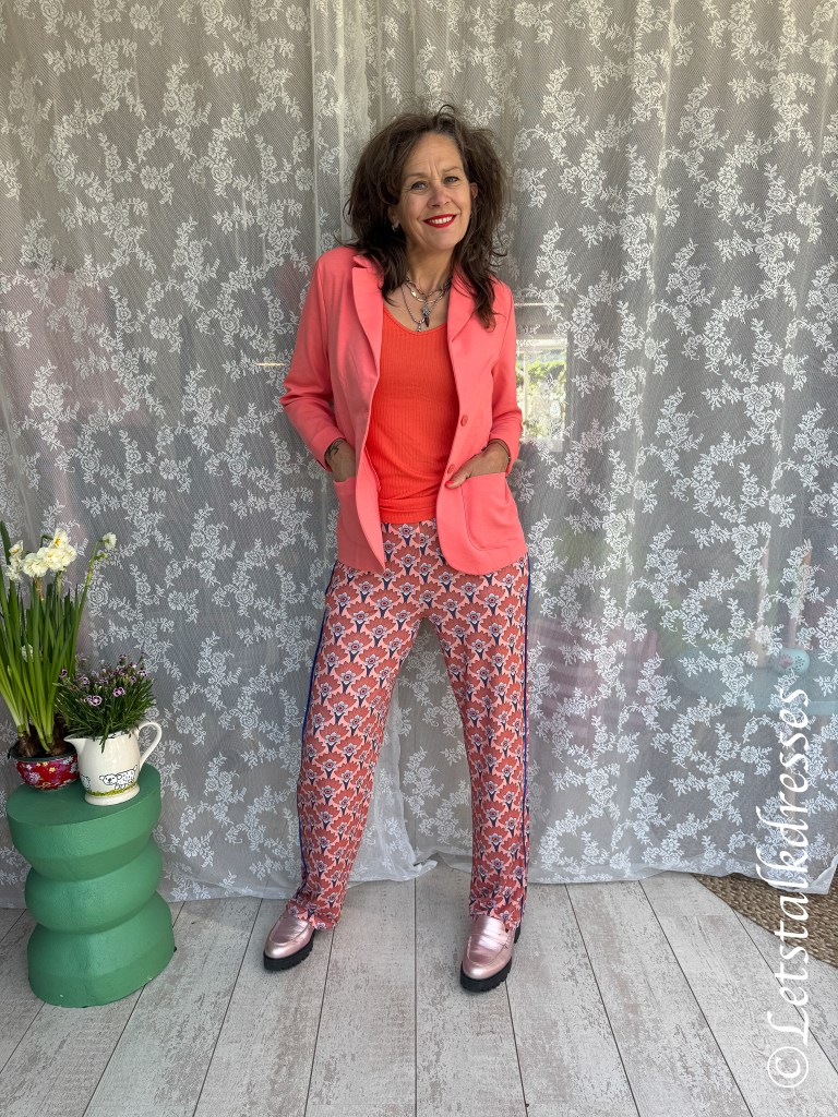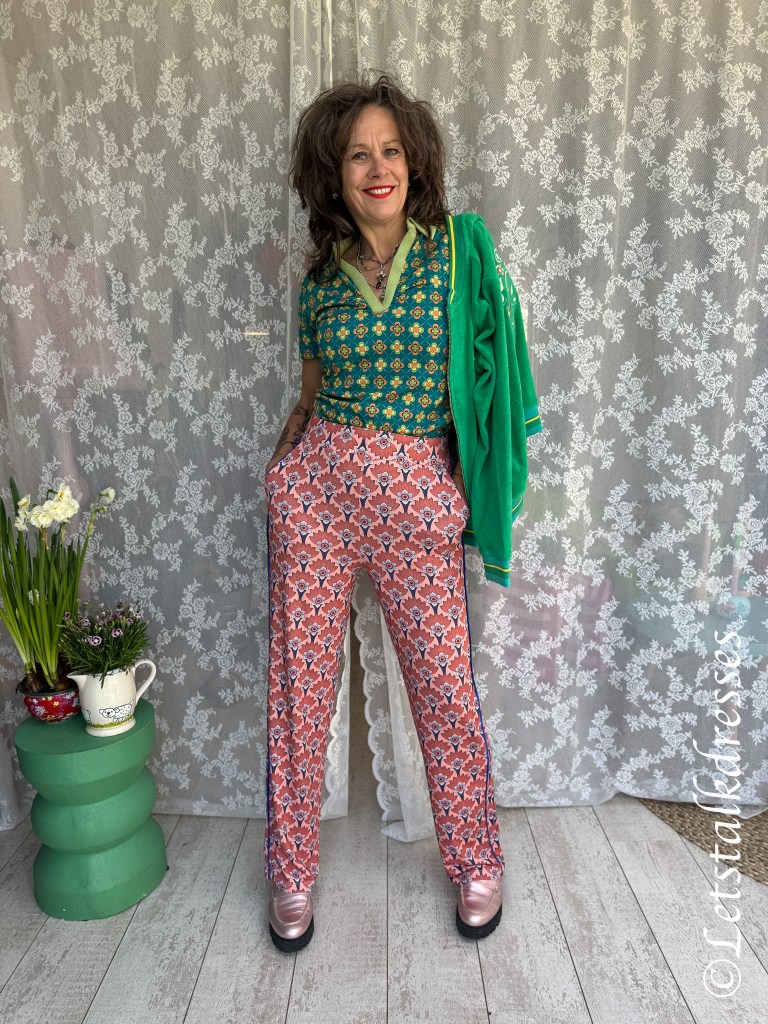 De seventies bloemetjes zijn een combinatie van verschillende kleuren groen en coral of zalmoranje. Ondanks de wat koelere groen van de ondergrond, komt de totale print heel warm en zacht over. En meiden, hij staat me een partij gaaf op een jeans zeg!!!