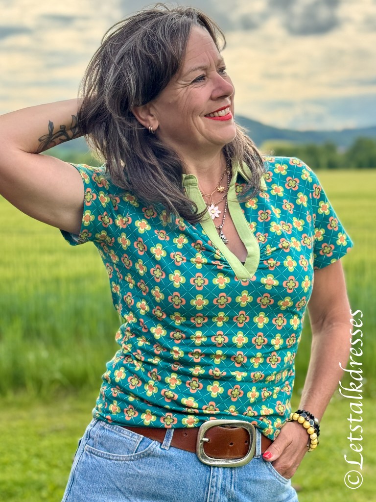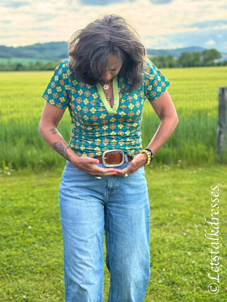 Hij komt deze zomer in maar liefst 12 uitvoeringen!!! Ik koos voor de variant met de duotone: een print met een effen halslijn/kraag. Daar zijn 2 varianten in: de Vintage Fever en de Summer Stripes Green. Het geeft dit shirt nou net even een beetje meer pit.