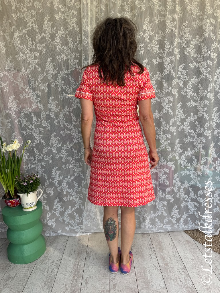 Wat wel weer heel gaaf is, is het ronde kraagje met de piping in contrasterend wit. Deze piping zit ook op de mouwtjes en op de schouders. Het maakt het jurkje extra retro. Het kraagje gaat weer over in 4 knoopjes die je los en vast kan dragen. Los is meer stoerder, vast is meer jaren vijftig kittig. Beiden vind ik erg tof.
