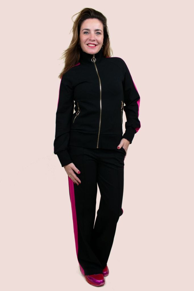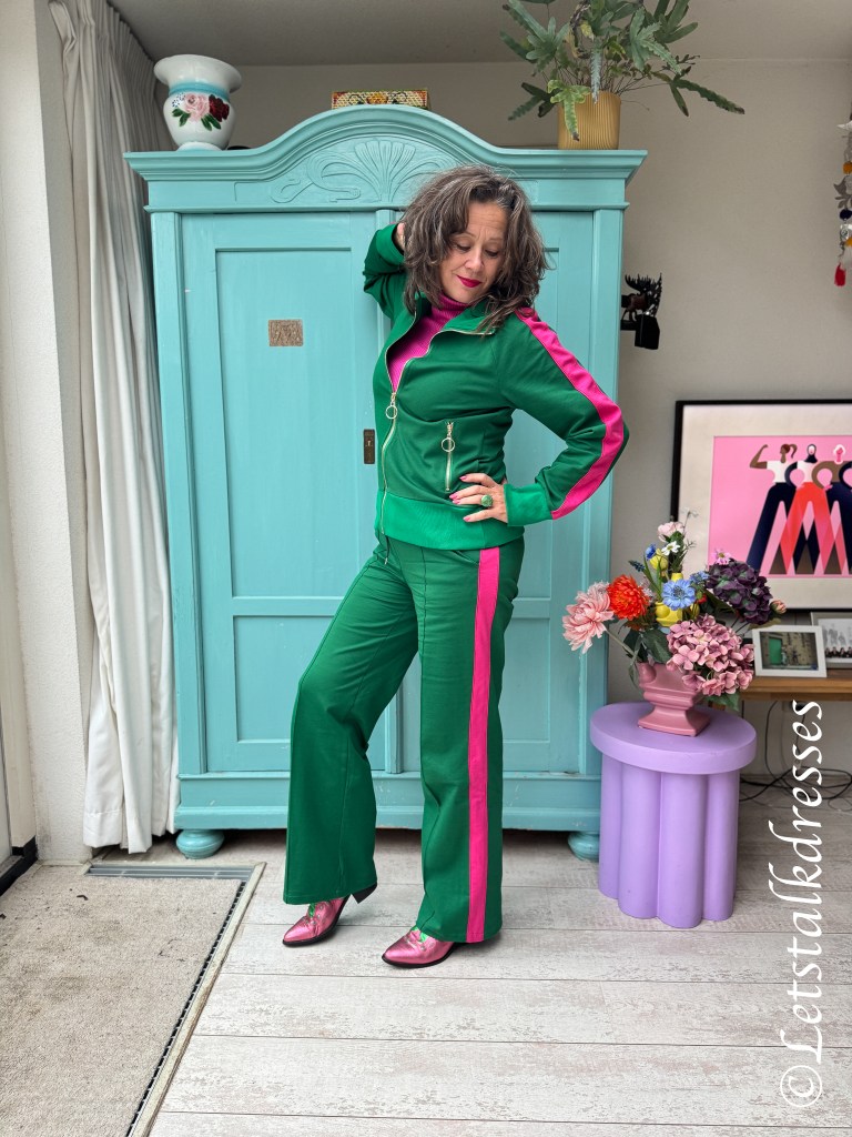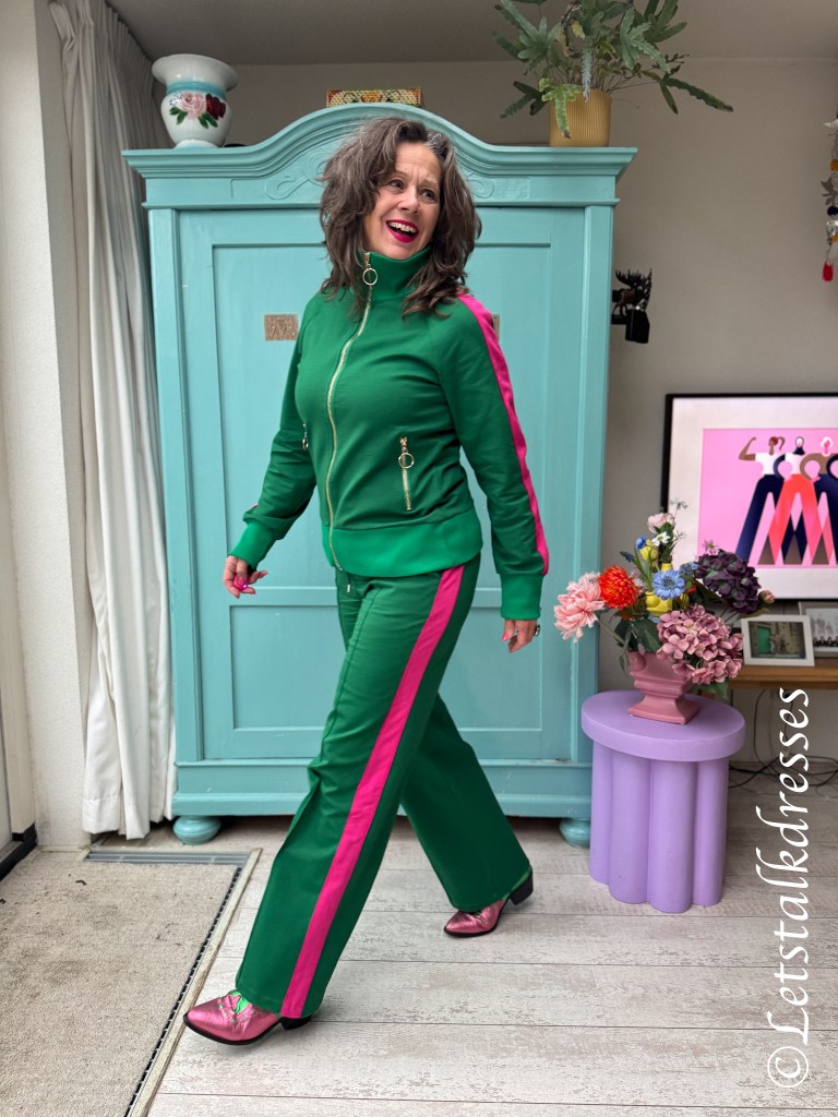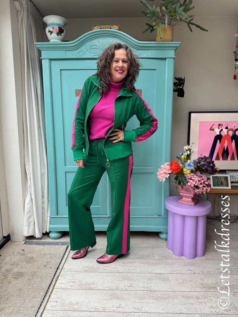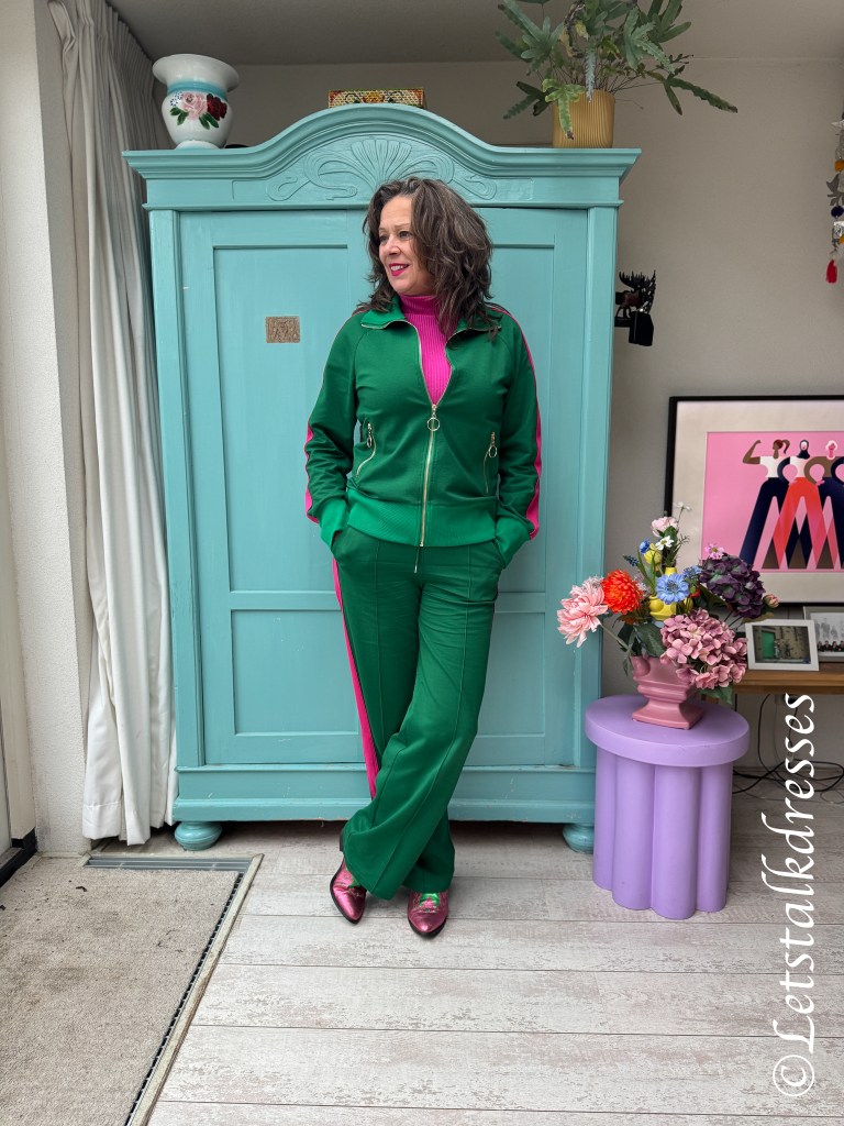 Allereerst: er is een verschil tussen een tracksuit en een sweatsuit. Waar je een tracksuit vooral vindt in sportieve omgevingen, vind je een sweatsuit vooral als lounchewear. Dus meer thuis en in een wat informelere omgeving. Tracksuits kan je in gedekte kleuren dragen maar doen het ook uitstekend in een kleurrijke variant. En ze zijn super gevarieerd af te stylen. In mijn reel zal ik ook meerdere variaties laten zien. In deze blog zie je vooral de ‘technische informatie’.