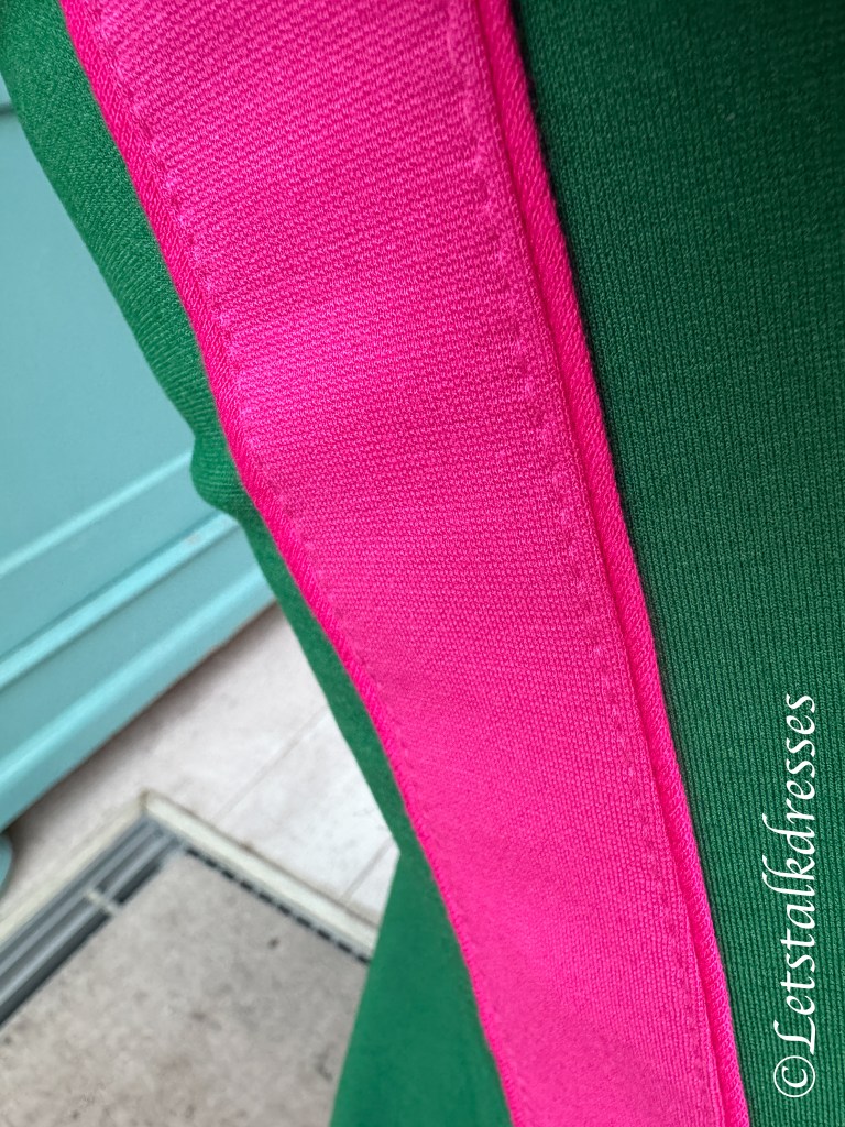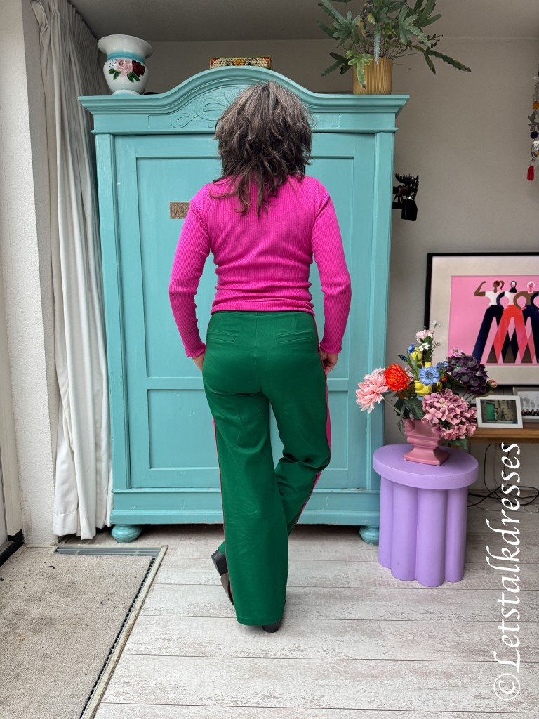 De brede roze biezen zijn gemaakt van 2 stoffen: het mooie tricot Punto Milano dus, maar ze hebben ook een klein gewoven biesje ernaast in dezelfde kleur maar van een ander stofje. Dat geeft de bies echt een extra spicey edge.