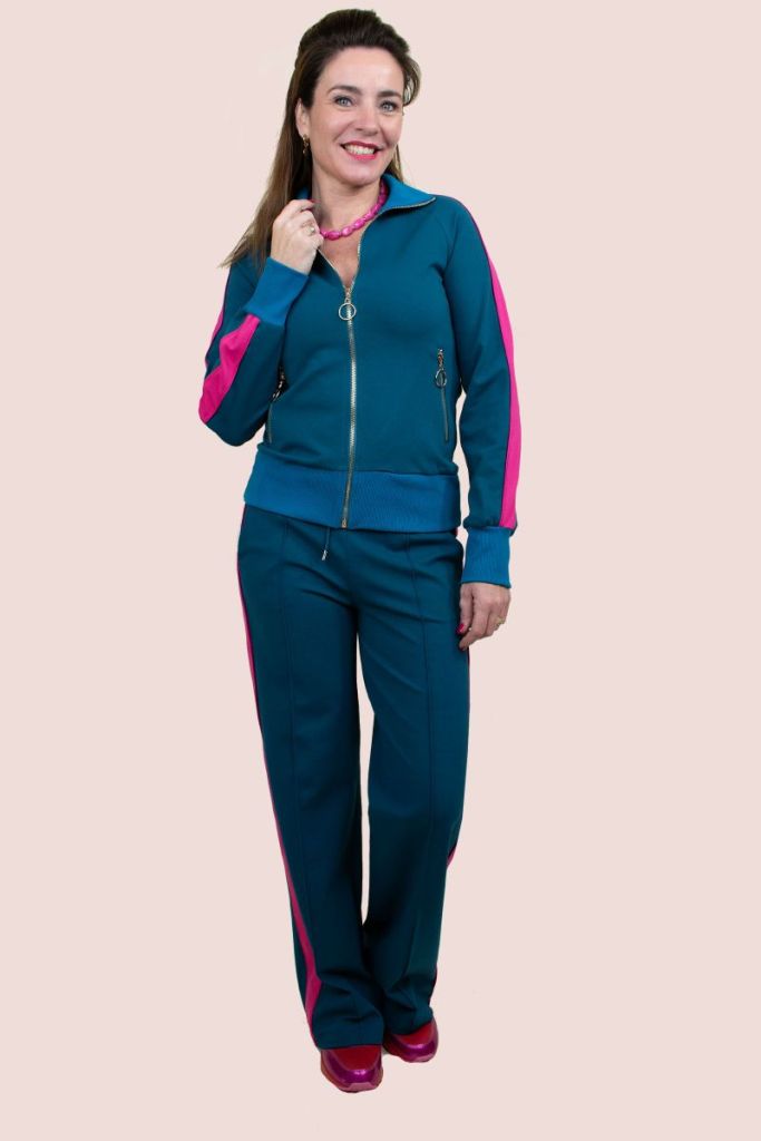 Dit kleurrijke trainingspak van Tante zit boordevol details, zoals je wel gewend bent van dit label: De ritsen in het jasje zijn gemaakt van een licht goudkleurig metaal (lopen echt lekker soepel) en hebben een kek rondje als trekhaakje (een ringpuller). Het Nikky Jacket heeft heel brede manchetten, kraag en boord. Die springen er dan ook echt uit.